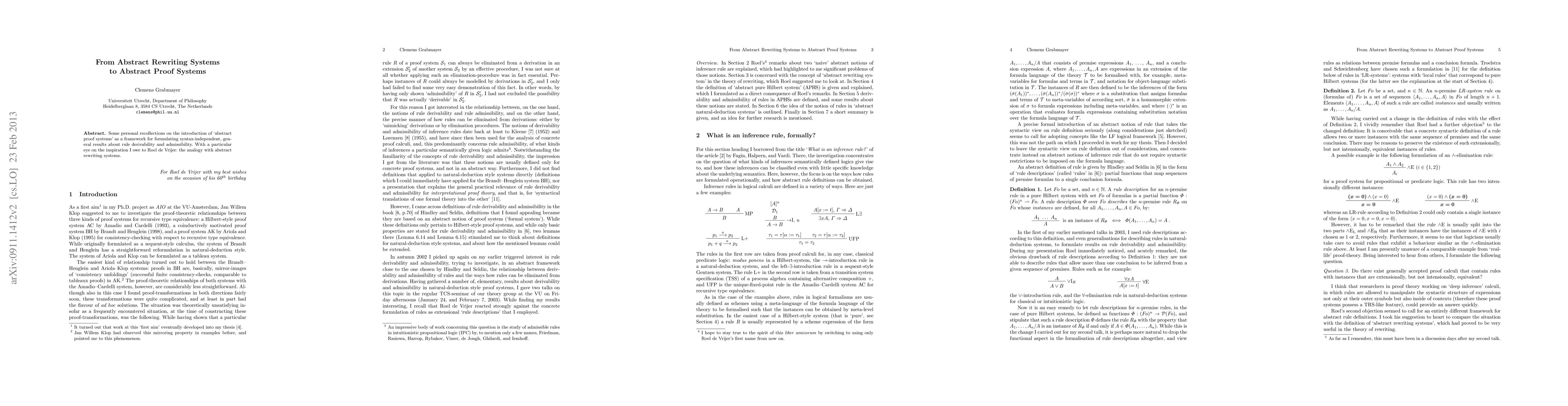 This paper reflects on the development of abstract proof systems as a syntax-independent framework for rule derivability and admissibility, drawing inspiration from the analogy with abstract rewriting systems, particularly acknowledging Roel de Vrijer's influence.