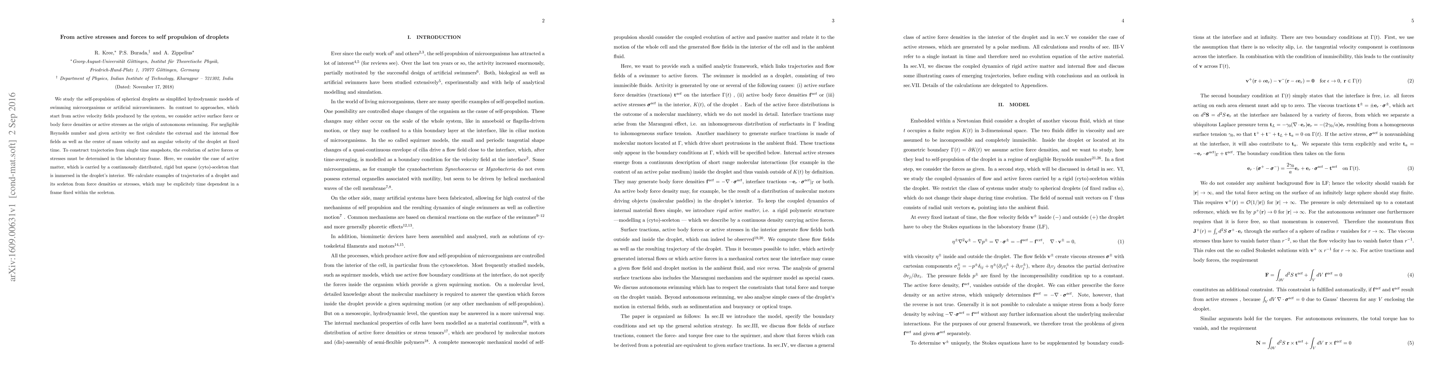 We study the self-propulsion of spherical droplets as simplified hydrodynamic models of swimming microorganisms or artificial microswimmers. In contrast to approaches, which start from active velocity fields produced by the system, we consider active surface force or body force densities or active stresses as the origin of autonomous swimming. For negligible Reynolds number and given activity we first calculate the external and the internal ow fields as well as the center of mass velocity and an angular velocity of the droplet at fixed time. To construct trajectories from single time snapshots, the evolution of active forces or stresses must be determined in the laboratory frame. Here, we consider the case of active matter, which is carried by a continuously distributed, rigid but sparse (cyto)-sceleton that is immersed in the droplet's interior. We calculate examples of trajectories of a droplet and its sceleton from force densities or stresses, which may be explicitely time dependent in a frame fixed within the sceleton
