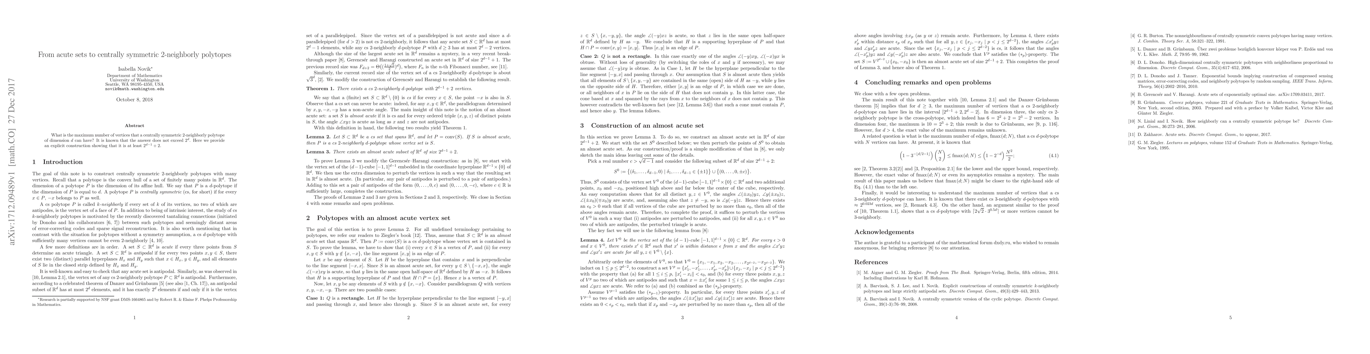 Summary: This paper investigates the maximum number of vertices in centrally symmetric 2-neighborly polytopes of dimension $d$, proving that the lower bound is $2^{d-1}+2$ through an explicit construction, while confirming the upper bound does not exceed $2^d$.