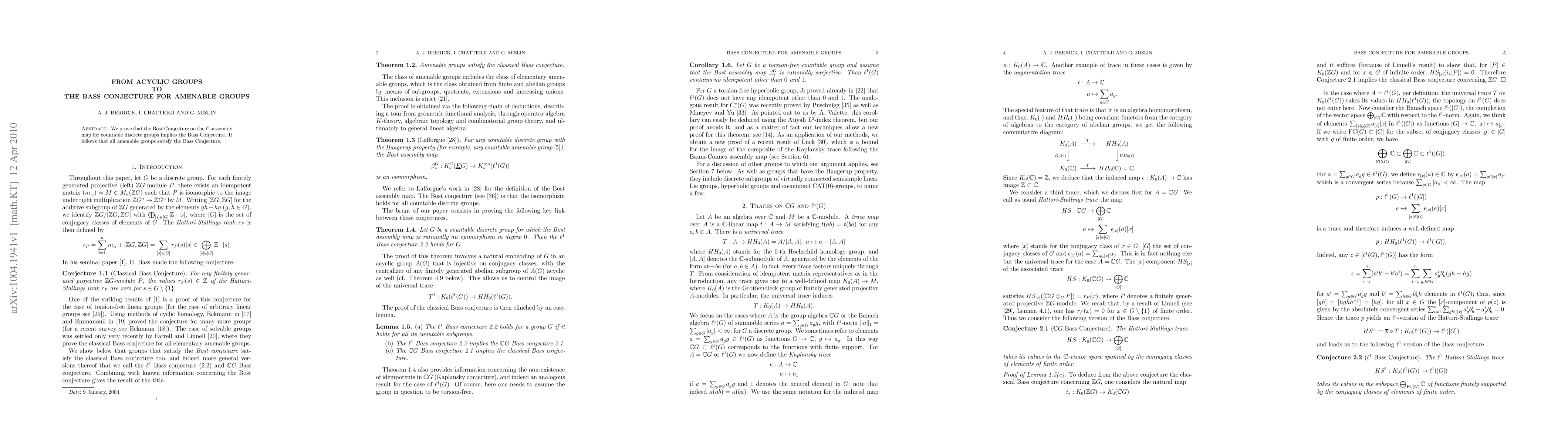 Summary: The paper proves that the Bost Conjecture for countable discrete groups implies the Bass Conjecture, thereby establishing that all amenable groups satisfy the Bass Conjecture. This result bridges the gap between acyclic groups and the Bass Conjecture.
