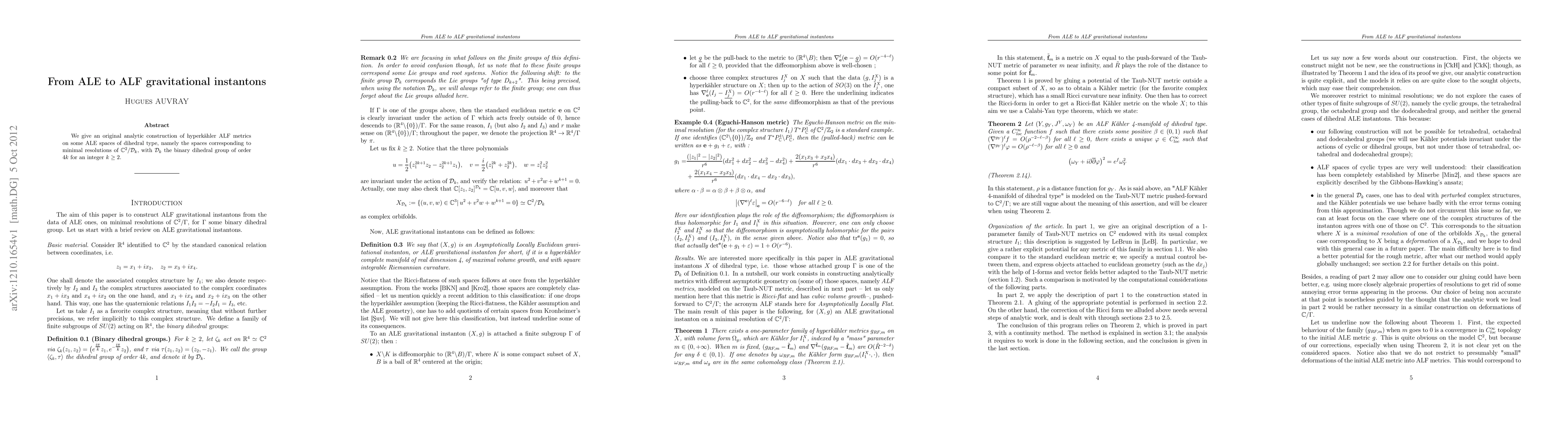 This paper presents a novel analytic method to construct hyperkähler ALF metrics on specific ALE spaces linked to minimal resolutions of Kleinian quotients related to binary dihedral groups. The focus is on the geometric and topological properties of these gravitational instantons.