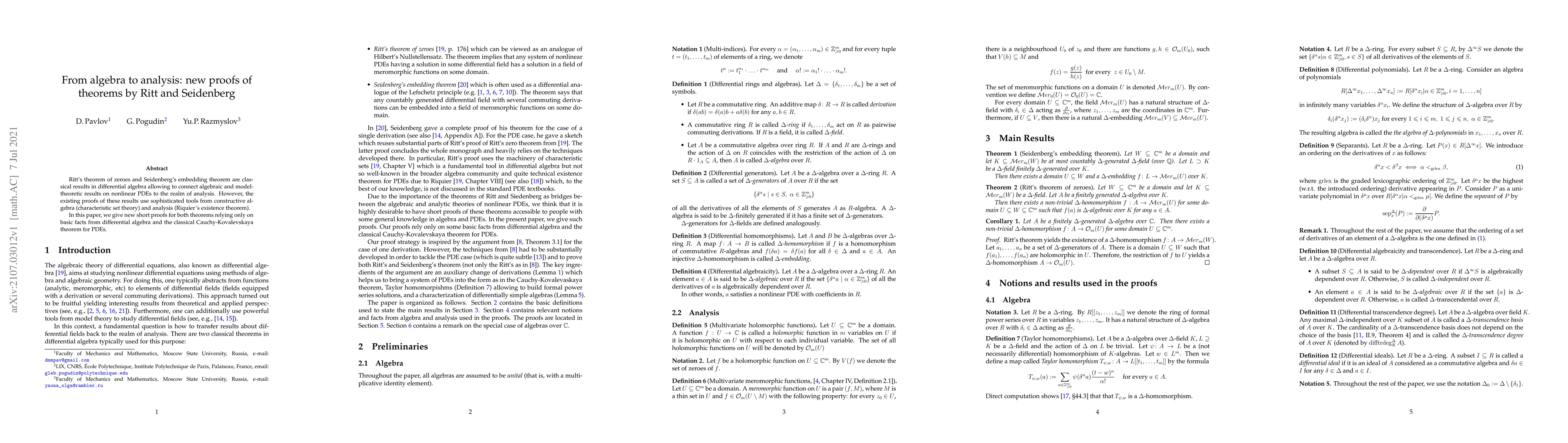 Ritt's theorem of zeroes and Seidenberg's embedding theorem are classical results in differential algebra allowing to connect algebraic and model-theoretic results on nonlinear PDEs to the realm of analysis. However, the existing proofs of these results use sophisticated tools from constructive algebra (characteristic set theory) and analysis (Riquier's existence theorem). In this paper, we give new short proofs for both theorems relying only on basic facts from differential algebra and the classical Cauchy-Kovalevskaya theorem for PDEs.