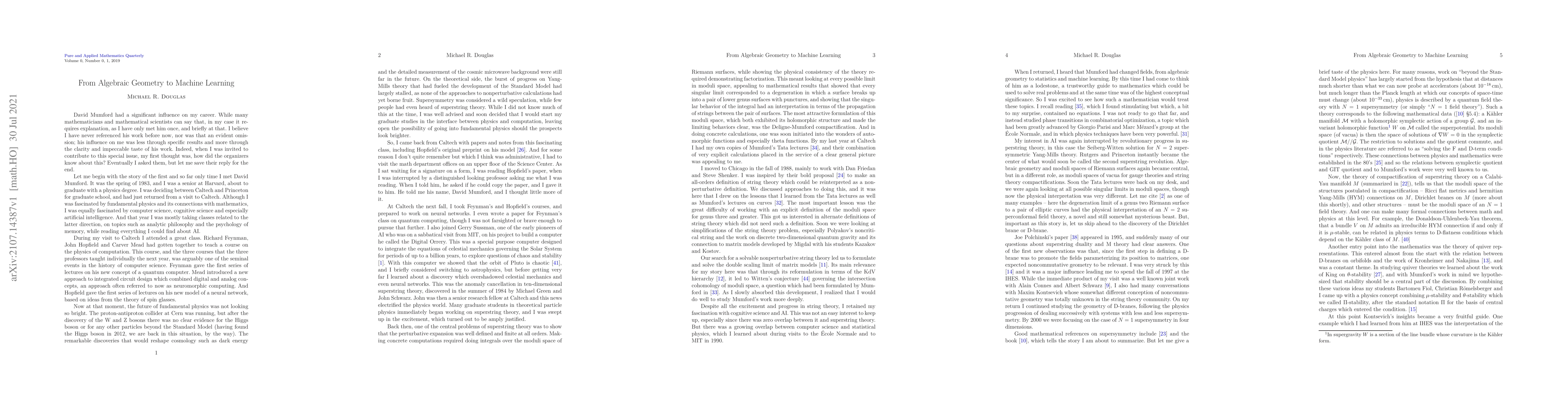 Summary: This paper reflects on David Mumford's influential contributions to both algebraic geometry and machine learning, highlighting how his pioneering work in both pure and applied mathematics has shaped the author's career.