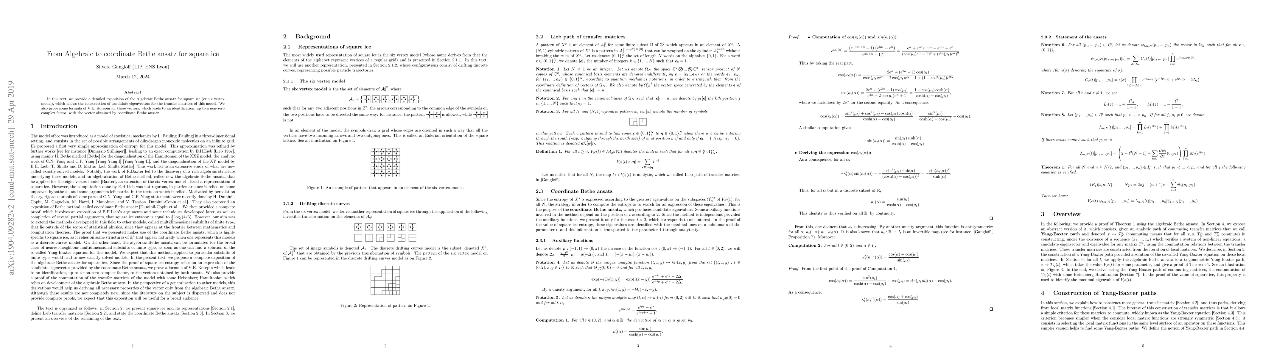 In this text, we provide a detailed exposition of the Algebraic Bethe ansatz for square ice (or six vertex model), which allows the construction of candidate eigenvectors for the transfer matrices of this model. We also prove some formula of V.E. Korepin for these vectors, which leads to an identification, up to a non-zero complex factor, with the vector obtained by coordinate Bethe ansatz.