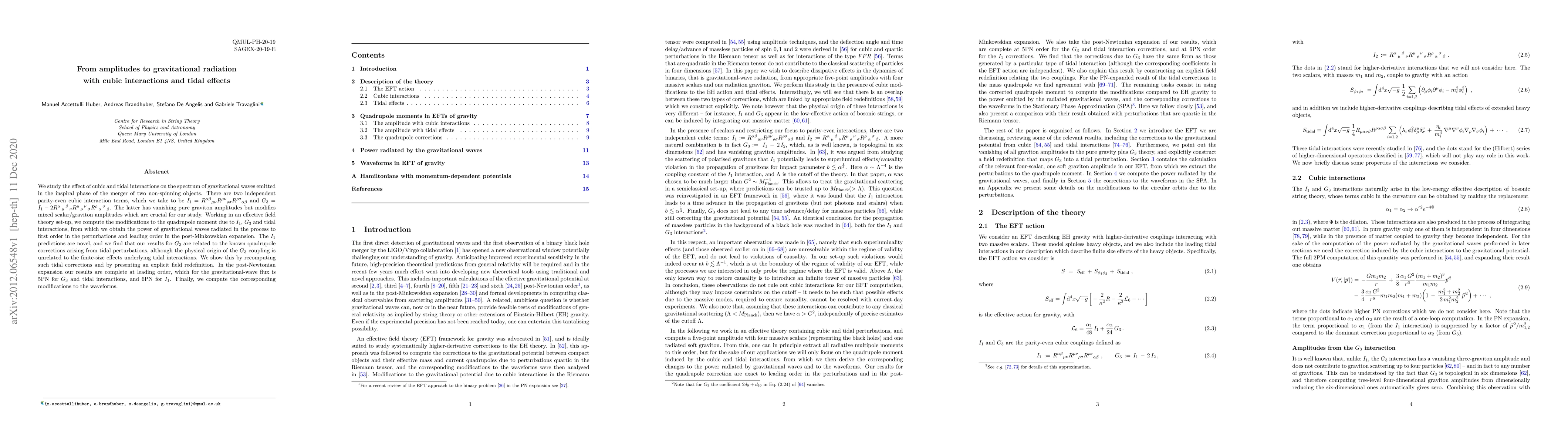 We study the effect of cubic and tidal interactions on the spectrum of gravitational waves emitted in the inspiral phase of the merger of two non-spinning objects. There are two independent parity-even cubic interaction terms, which we take to be $I_1 = {R^{\alpha \beta}}_{\mu \nu} {R^{\mu \nu}}_{\rho \sigma} {R^{\rho \sigma}}_{\alpha \beta}$ and $G_3 = I_1-2 R^{\alpha}\,_{\mu}\,^{\beta}\,_{\nu} R^{\mu}\,_{\rho}\,^{\nu}\,_{\sigma} R^{\rho}\,_{\alpha}\,^{\sigma}\,_{\beta}$. The latter has vanishing pure graviton amplitudes but modifies mixed scalar/graviton amplitudes which are crucial for our study. Working in an effective field theory set-up, we compute the modifications to the quadrupole moment due to $I_1$, $G_3$ and tidal interactions, from which we obtain the power of gravitational waves radiated in the process to first order in the perturbations and leading order in the post-Minkowskian expansion. The $I_1$ predictions are novel, and we find that our results for $G_3$ are related to the known quadrupole corrections arising from tidal perturbations, although the physical origin of the $G_3$ coupling is unrelated to the finite-size effects underlying tidal interactions. We show this by recomputing such tidal corrections and by presenting an explicit field redefinition. In the post-Newtonian expansion our results are complete at leading order, which for the gravitational-wave flux is 5PN for $G_3$ and tidal interactions, and 6PN for $I_1$. Finally, we compute the corresponding modifications to the waveforms.