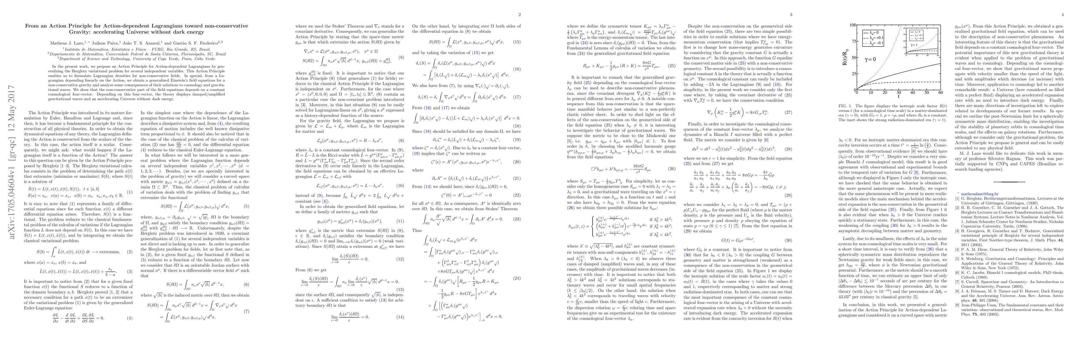 This paper proposes an Action Principle for action-dependent Lagrangians to formulate non-conservative gravity, leading to a generalized Einstein's field equation. It demonstrates the theory's potential to explain an accelerating universe without invoking dark energy, instead attributing it to a constant cosmological four-vector.