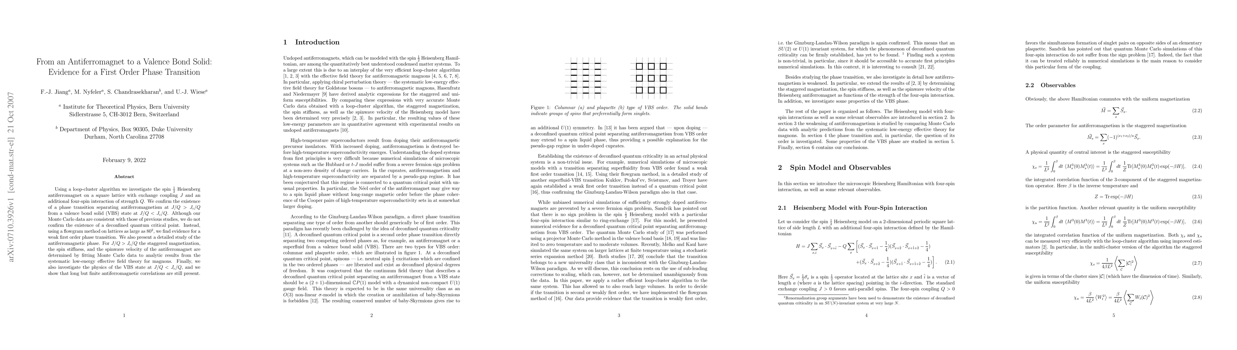 Using a loop-cluster algorithm we investigate the spin 1/2 Heisenberg antiferromagnet on a square lattice with exchange coupling $J$ and an additional four-spin interaction of strength $Q$. We confirm the existence of a phase transition separating antiferromagnetism at $J/Q > J_c/Q$ from a valence bond solid (VBS) state at $J/Q < J_c/Q$. Although our Monte Carlo data are consistent with those of previous studies, we do not confirm the existence of a deconfined quantum critical point. Instead, using a flowgram method on lattices as large as $80^2$, we find evidence for a weak first order phase transition. We also present a detailed study of the antiferromagnetic phase. For $J/Q > J_c/Q$ the staggered magnetization, the spin stiffness, and the spinwave velocity of the antiferromagnet are determined by fitting Monte Carlo data to analytic results from the systematic low-energy effective field theory for magnons. Finally, we also investigate the physics of the VBS state at $J/Q < J_c/Q$, and we show that long but finite antiferromagnetic correlations are still present.