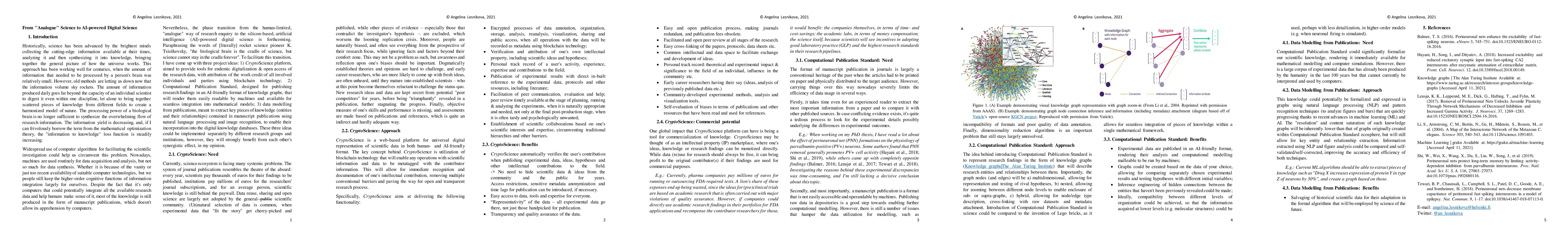 Phase transition from the human-limited, "analogue" way of research enquiry to the silicon-based, artificial intelligence (AI)-powered digital science is forthcoming. To facilitate this transition, I propose three project ideas: 1) CryptoScience platform, aimed to provide tools for endemic digitalization & open access of the research data, with attribution of the work credit of all involved individuals and parties using blockchain technology; 2) Computational Publication Standard, designed for publishing research findings in an AI-friendly format of knowledge graphs; 3) data modelling from publications, meant to extract key pieces of knowledge (entities and their relationships) contained in manuscript publications using natural language processing and image recognition, to enable their incorporation into the digital knowledge databases. These three ideas could be implemented separately by different research groups and institutions, however, they will strongly benefit from each other's synergistic effect.