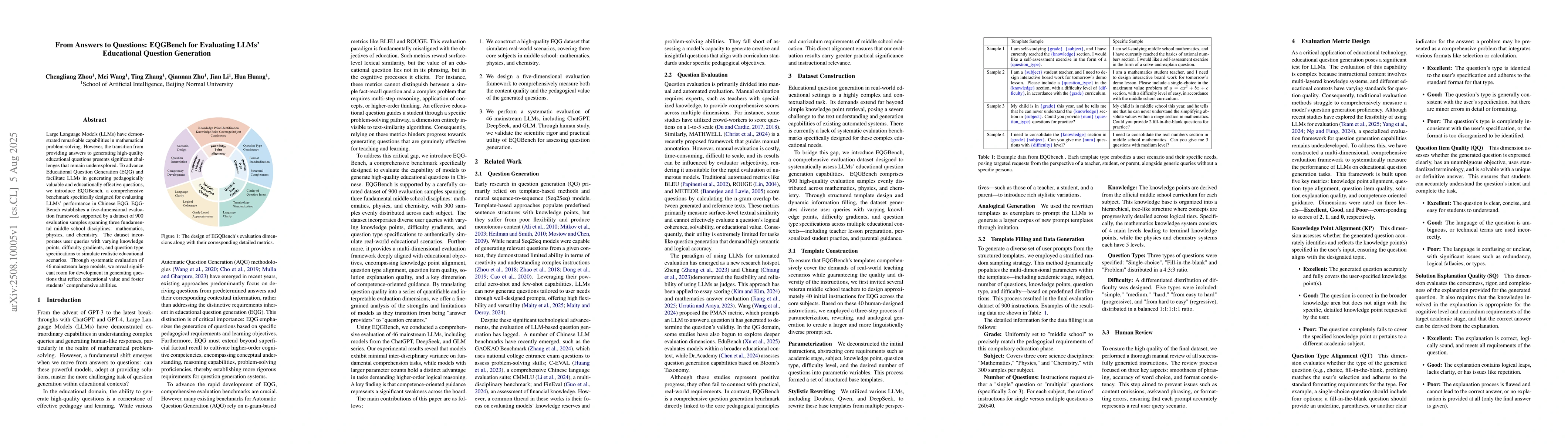 Large Language Models (LLMs) have demonstrated remarkable capabilities in mathematical problem-solving. However, the transition from providing answers to generating high-quality educational questions presents significant challenges that remain underexplored. To advance Educational Question Generation (EQG) and facilitate LLMs in generating pedagogically valuable and educationally effective questions, we introduce EQGBench, a comprehensive benchmark specifically designed for evaluating LLMs' performance in Chinese EQG. EQGBench establishes a five-dimensional evaluation framework supported by a dataset of 900 evaluation samples spanning three fundamental middle school disciplines: mathematics, physics, and chemistry. The dataset incorporates user queries with varying knowledge points, difficulty gradients, and question type specifications to simulate realistic educational scenarios. Through systematic evaluation of 46 mainstream large models, we reveal significant room for development in generating questions that reflect educational value and foster students' comprehensive abilities.