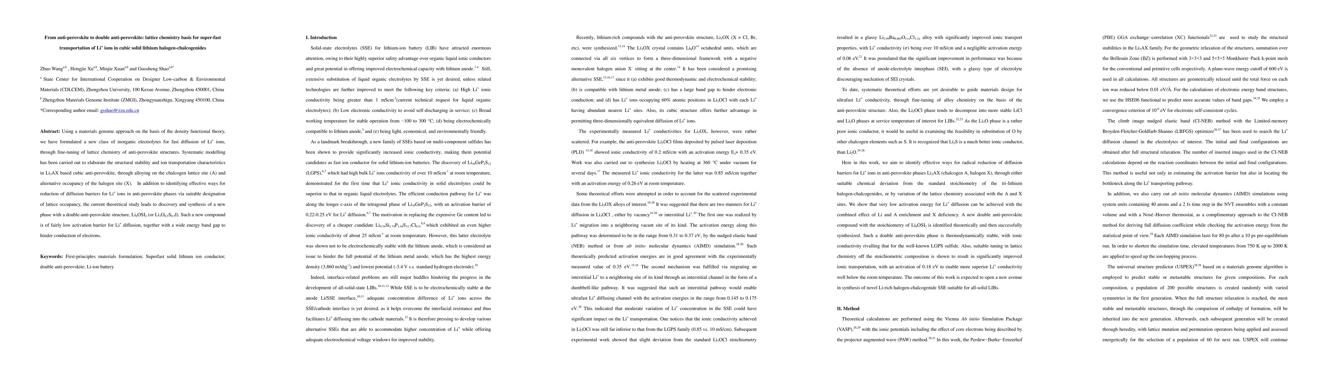 This research identifies new inorganic electrolytes for fast Li+ ion diffusion by fine-tuning the lattice chemistry of anti-perovskite structures, leading to the discovery of a double-anti-perovskite compound, Li6OSI2, with low activation barriers for Li+ transport and a wide band gap for electron conduction.