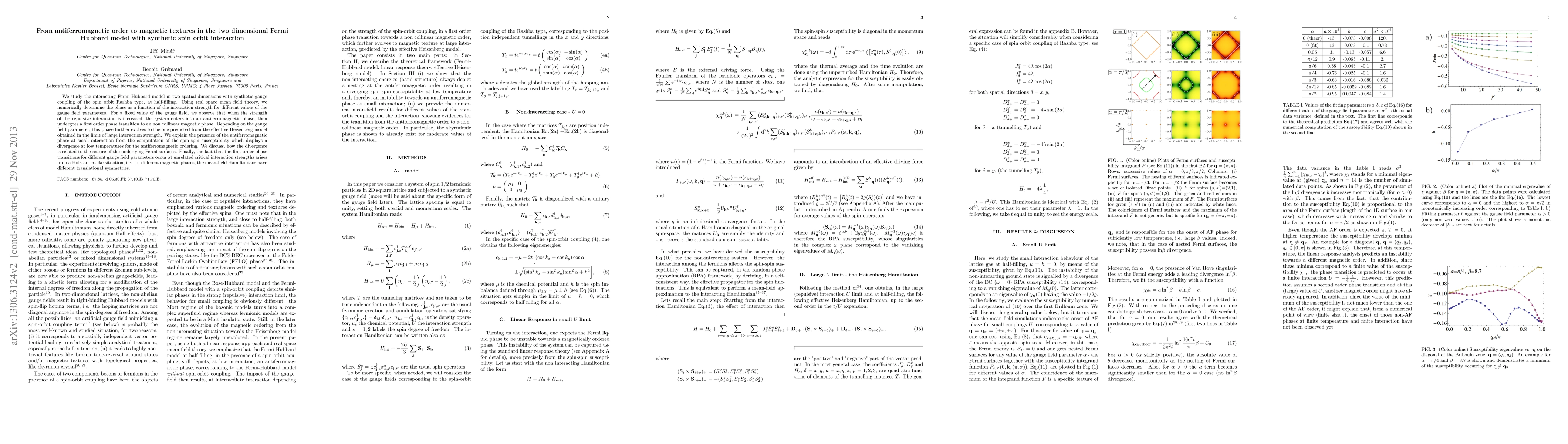 We study the interacting Fermi-Hubbard model in two spatial dimensions with synthetic gauge coupling of the spin orbit Rashba type, at half-filling. Using real space mean field theory, we numerically determine the phase as a function of the interaction strength for different values of the gauge field parameters. For a fixed value of the gauge field, we observe that when the strength of the repulsive interaction is increased, the system enters into an antiferromagnetic phase, then undergoes a first order phase transition to an non collinear magnetic phase. Depending on the gauge field parameter, this phase further evolves to the one predicted from the effective Heisenberg model obtained in the limit of large interaction strength. We explain the presence of the antiferromagnetic phase at small interaction from the computation of the spin-spin susceptibility which displays a divergence at low temperatures for the antiferromagnetic ordering. We discuss, how the divergence is related to the nature of the underlying Fermi surfaces. Finally, the fact that the first order phase transitions for different gauge field parameters occur at unrelated critical interaction strengths arises from a Hofstadter-like situation, i.e. for different magnetic phases, the mean-field Hamiltonians have different translational symmetries.