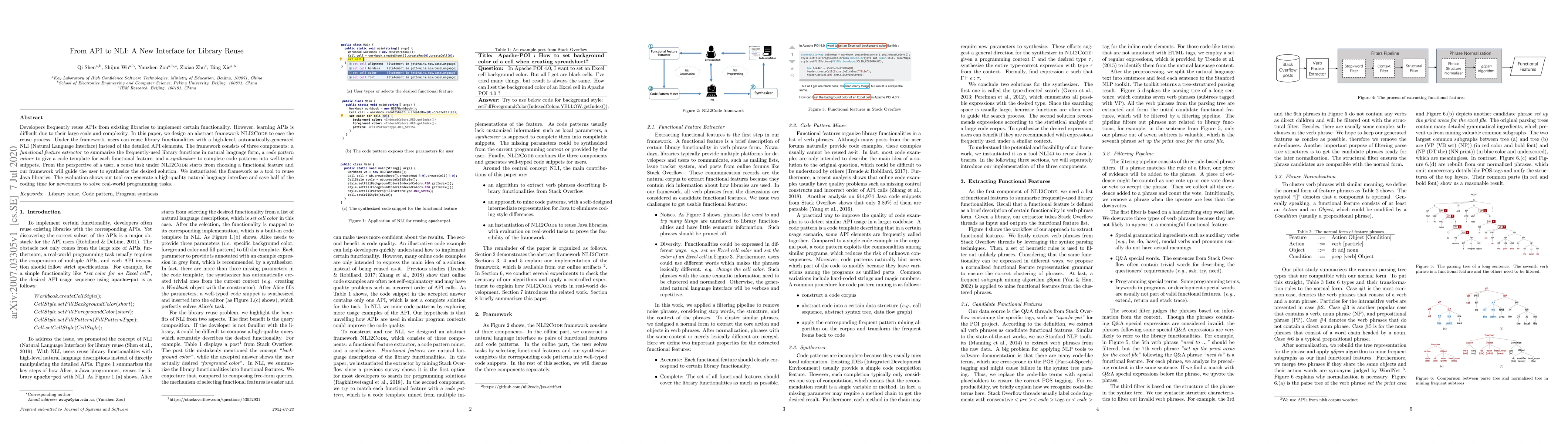 This paper introduces NLI2Code, a framework that simplifies library reuse by using a high-level natural language interface instead of complex APIs. The tool includes a feature extractor, code pattern miner, and synthesizer, and evaluation shows it reduces coding time by half for newcomers.