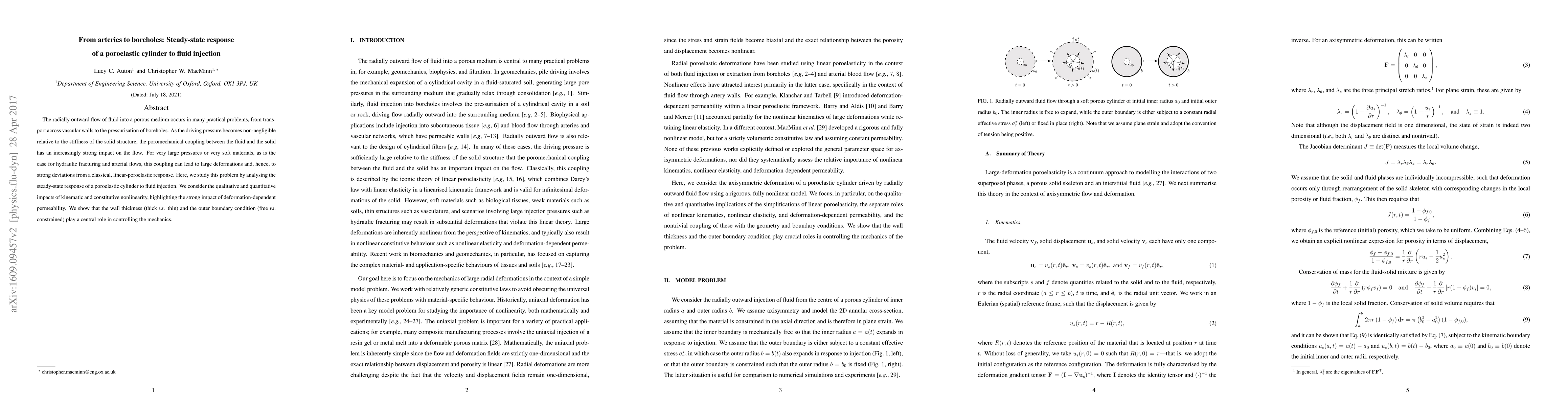 The radially outward flow of fluid into a porous medium occurs in many practical problems, from transport across vascular walls to the pressurisation of boreholes. As the driving pressure becomes non-negligible relative to the stiffness of the solid structure, the poromechanical coupling between the fluid and the solid has an increasingly strong impact on the flow. For very large pressures or very soft materials, as is the case for hydraulic fracturing and arterial flows, this coupling can lead to large deformations and, hence, to strong deviations from a classical, linear-poroelastic response. Here, we study this problem by analysing the steady-state response of a poroelastic cylinder to fluid injection. We consider the qualitative and quantitative impacts of kinematic and constitutive nonlinearity, highlighting the strong impact of deformation-dependent permeability. We show that the wall thickness (thick vs. thin) and the outer boundary condition (free vs. constrained) play a central role in controlling the mechanics.