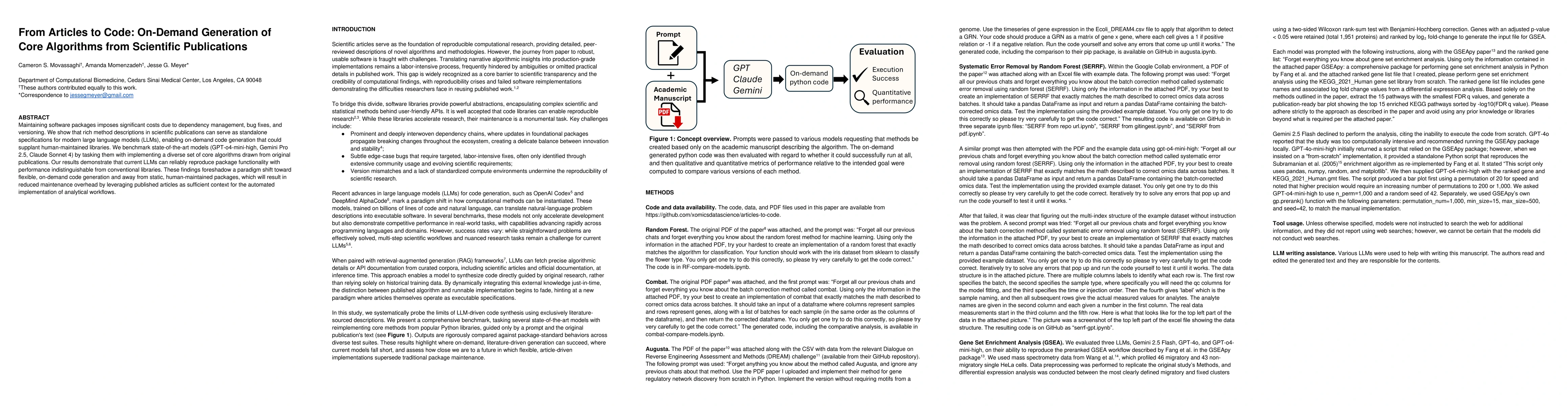 Maintaining software packages imposes significant costs due to dependency management, bug fixes, and versioning. We show that rich method descriptions in scientific publications can serve as standalone specifications for modern large language models (LLMs), enabling on-demand code generation that could supplant human-maintained libraries. We benchmark state-of-the-art models (GPT-o4-mini-high, Gemini Pro 2.5, Claude Sonnet 4) by tasking them with implementing a diverse set of core algorithms drawn from original publications. Our results demonstrate that current LLMs can reliably reproduce package functionality with performance indistinguishable from conventional libraries. These findings foreshadow a paradigm shift toward flexible, on-demand code generation and away from static, human-maintained packages, which will result in reduced maintenance overhead by leveraging published articles as sufficient context for the automated implementation of analytical workflows.