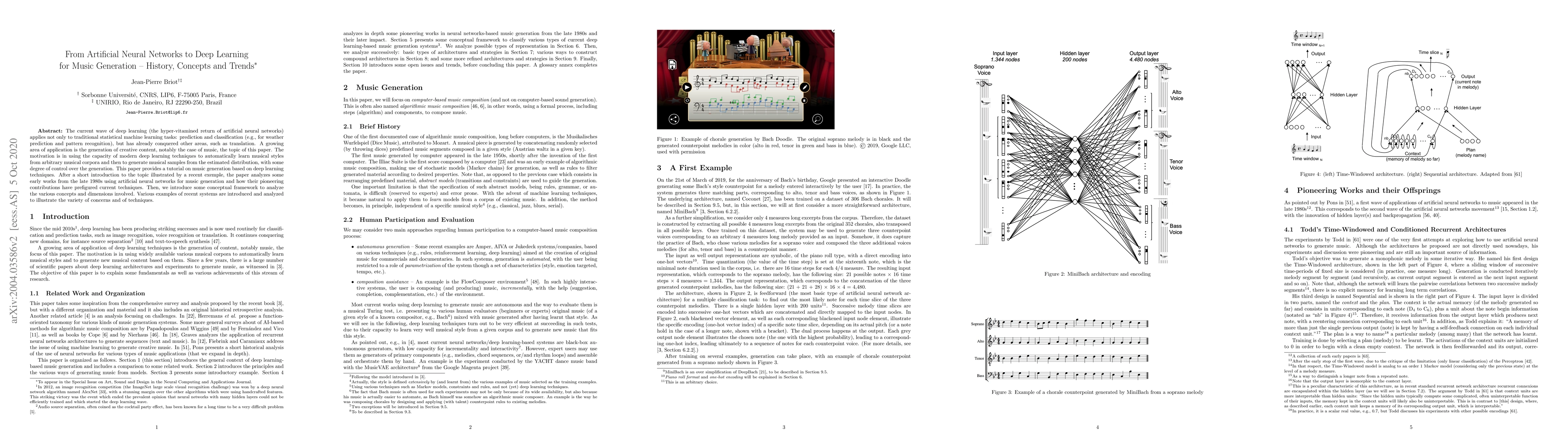 This paper explores the history and concepts of using deep learning techniques to generate music, from early artificial neural networks to current methods that can learn musical styles and generate samples with control. It analyzes various recent systems and provides a tutorial on music generation based on deep learning.
