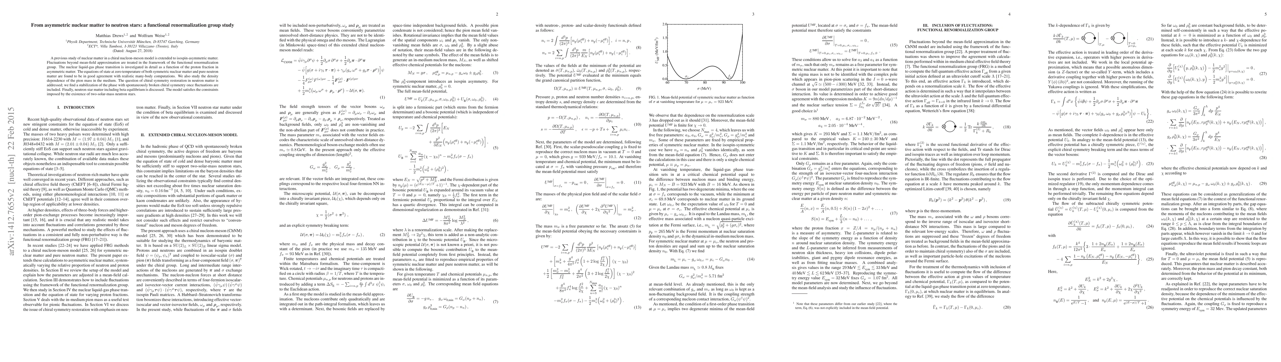 This paper extends a chiral nucleon-meson model to study isospin-asymmetric nuclear matter using functional renormalization group methods, finding good agreement with many-body computations for the equations of state. It investigates the nuclear liquid-gas phase transition and the density dependence of pion mass, concluding that chiral symmetry is restored in neutron matter when fluctuations are considered, and the model fits neutron star constraints.