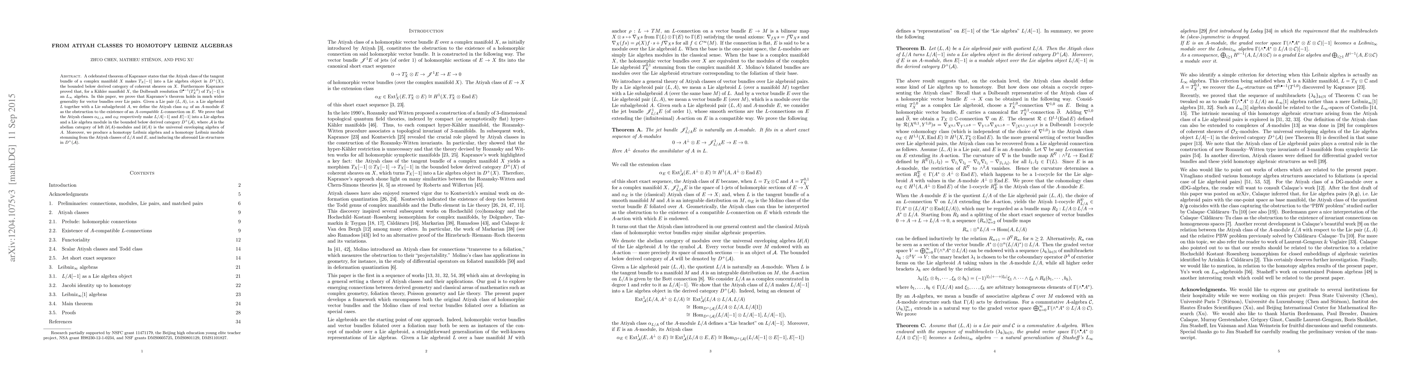 A celebrated theorem of Kapranov states that the Atiyah class of the tangent bundle of a complex manifold $X$ makes $T_X[-1]$ into a Lie algebra object in $D^+(X)$, the bounded below derived category of coherent sheaves on $X$. Furthermore Kapranov proved that, for a K\"ahler manifold $X$, the Dolbeault resolution $\Omega^{\bullet-1}(T_X^{1,0})$ of $T_X[-1]$ is an $L_\infty$ algebra. In this paper, we prove that Kapranov's theorem holds in much wider generality for vector bundles over Lie pairs. Given a Lie pair $(L,A)$, i.e. a Lie algebroid $L$ together with a Lie subalgebroid $A$, we define the Atiyah class $\alpha_E$ of an $A$-module $E$ (relative to $L$) as the obstruction to the existence of an $A$-compatible $L$-connection on $E$. We prove that the Atiyah classes $\alpha_{L/A}$ and $\alpha_E$ respectively make $L/A[-1]$ and $E[-1]$ into a Lie algebra and a Lie algebra module in the bounded below derived category $D^+(\mathcal{A})$, where $\mathcal{A}$ is the abelian category of left $\mathcal{U}(A)$-modules and $\mathcal{U}(A)$ is the universal enveloping algebra of $A$. Moreover, we produce a homotopy Leibniz algebra and a homotopy Leibniz module stemming from the Atiyah classes of $L/A$ and $E$, and inducing the aforesaid Lie structures in $D^+(\mathcal{A})$.