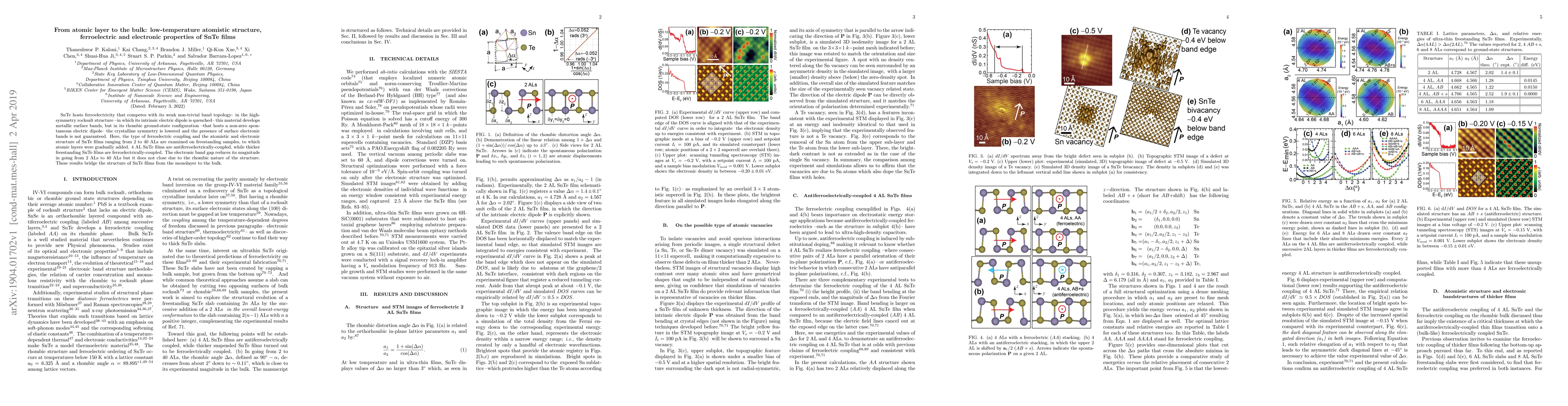 This study investigates the low-temperature atomistic structure, ferroelectricity, and electronic properties of SnTe films ranging from 2 to 40 atomic layers. It finds that while 4 AL films are antiferroelectrically coupled, thicker films exhibit ferroelectric coupling, and the electronic band gap decreases with increasing film thickness without closing due to the rhombic structure.