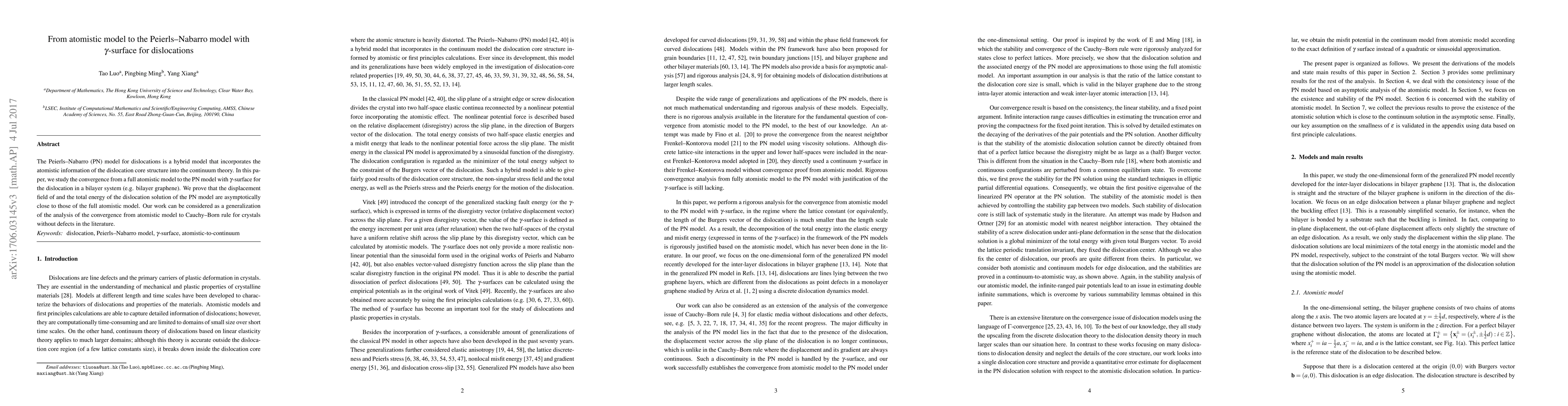 This paper investigates the convergence from a full atomistic model to the Peierls-Nabarro model incorporating a $\gamma$-surface for dislocations in bilayer systems, proving that the PN model's displacement field and total energy are asymptotically close to those of the atomistic model. This work extends previous analyses of the convergence from atomistic models to the Cauchy-Born rule for defect-free crystals.