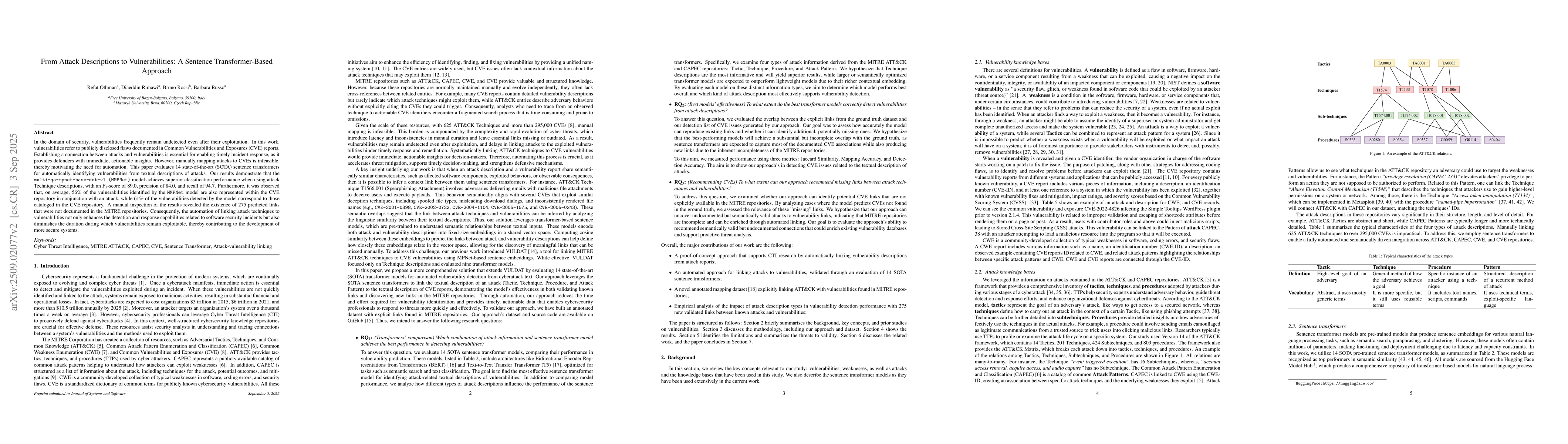 In the domain of security, vulnerabilities frequently remain undetected even after their exploitation. In this work, vulnerabilities refer to publicly disclosed flaws documented in Common Vulnerabilities and Exposures (CVE) reports. Establishing a connection between attacks and vulnerabilities is essential for enabling timely incident response, as it provides defenders with immediate, actionable insights. However, manually mapping attacks to CVEs is infeasible, thereby motivating the need for automation. This paper evaluates 14 state-of-the-art (SOTA) sentence transformers for automatically identifying vulnerabilities from textual descriptions of attacks. Our results demonstrate that the multi-qa-mpnet-base-dot-v1 (MMPNet) model achieves superior classification performance when using attack Technique descriptions, with an F1-score of 89.0, precision of 84.0, and recall of 94.7. Furthermore, it was observed that, on average, 56% of the vulnerabilities identified by the MMPNet model are also represented within the CVE repository in conjunction with an attack, while 61% of the vulnerabilities detected by the model correspond to those cataloged in the CVE repository. A manual inspection of the results revealed the existence of 275 predicted links that were not documented in the MITRE repositories. Consequently, the automation of linking attack techniques to vulnerabilities not only enhances the detection and response capabilities related to software security incidents but also diminishes the duration during which vulnerabilities remain exploitable, thereby contributing to the development of more secure systems.