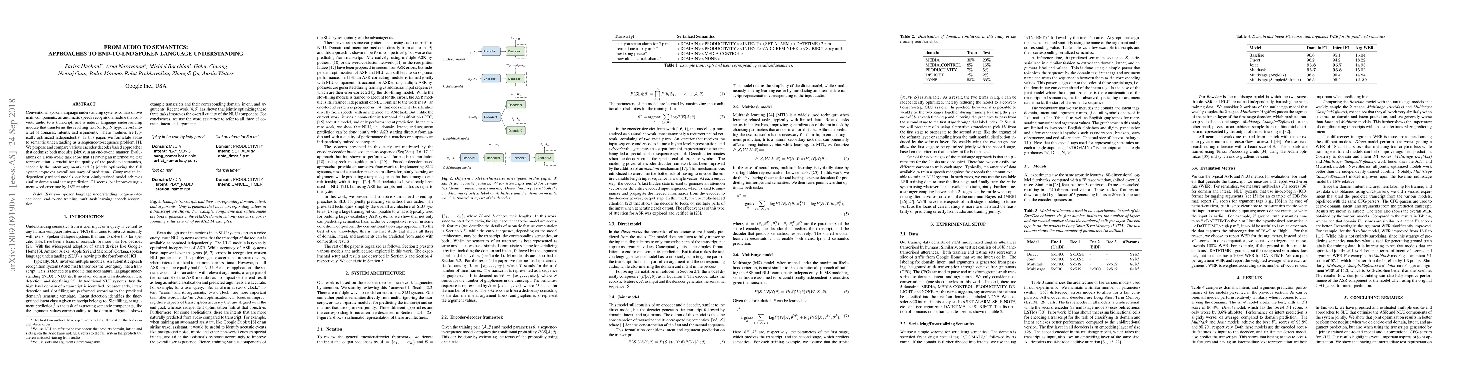 This paper proposes end-to-end approaches for spoken language understanding by jointly optimizing speech recognition and natural language understanding in an encoder-decoder framework. Results show that an intermediate text representation is vital for semantic accuracy, and joint optimization enhances overall prediction accuracy, particularly in argument prediction.