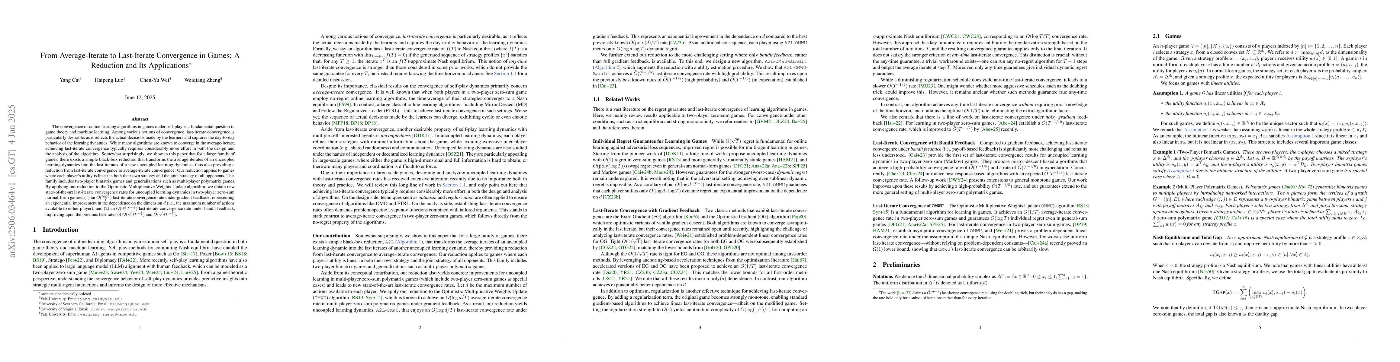 Researchers develop a black-box reduction to transform average-iterate convergence in games into last-iterate convergence, enabling improved rates for popular algorithms like Optimistic Multiplicative Weights Update.