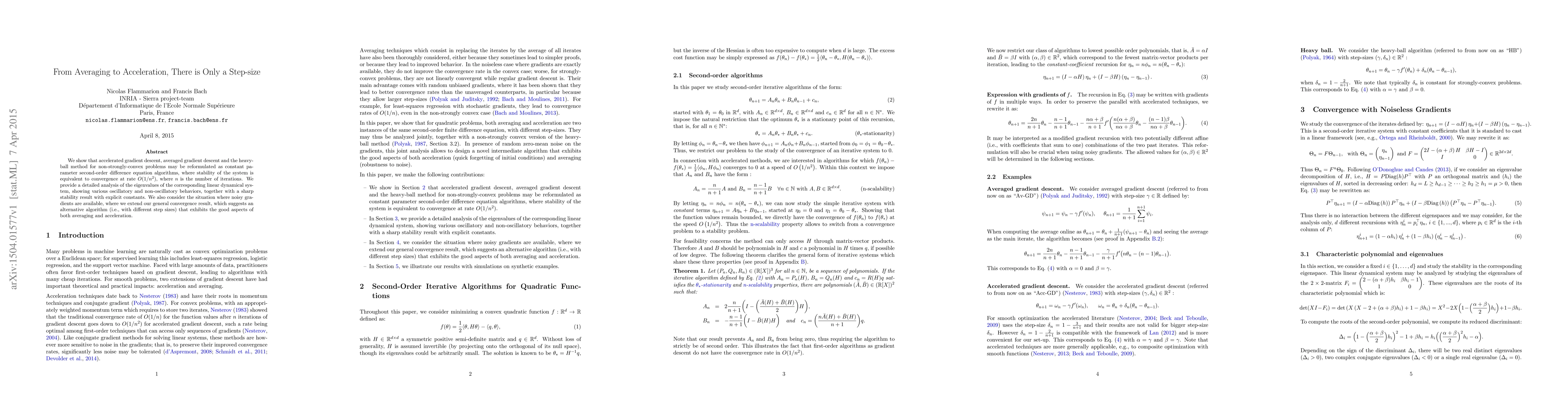 We show that accelerated gradient descent, averaged gradient descent and the heavy-ball method for non-strongly-convex problems may be reformulated as constant parameter second-order difference equation algorithms, where stability of the system is equivalent to convergence at rate O(1/n 2), where n is the number of iterations. We provide a detailed analysis of the eigenvalues of the corresponding linear dynamical system , showing various oscillatory and non-oscillatory behaviors, together with a sharp stability result with explicit constants. We also consider the situation where noisy gradients are available, where we extend our general convergence result, which suggests an alternative algorithm (i.e., with different step sizes) that exhibits the good aspects of both averaging and acceleration.