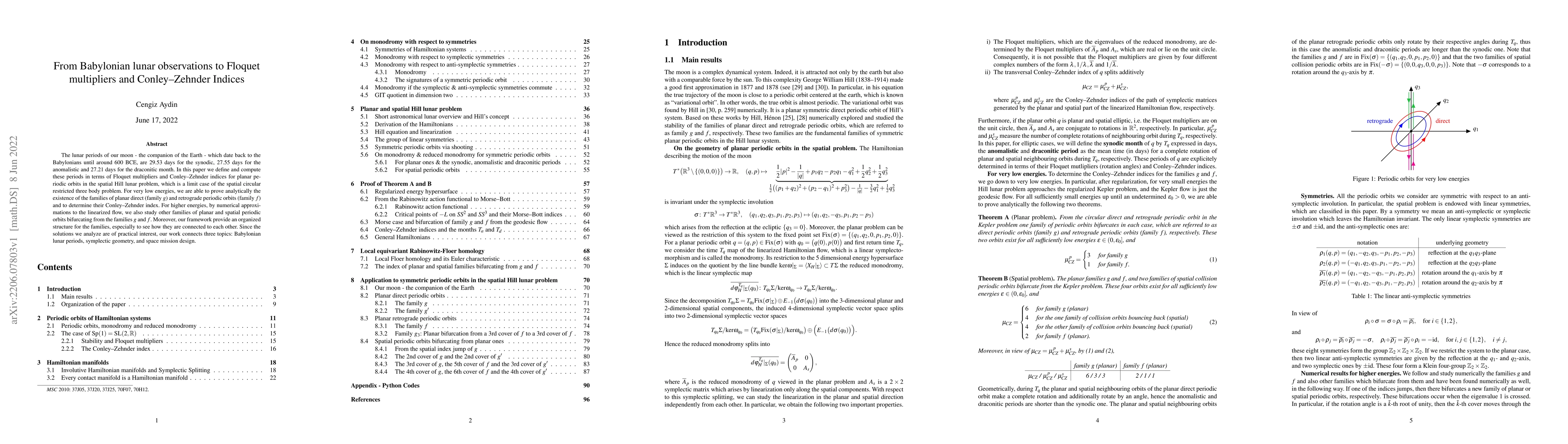 This paper connects ancient Babylonian lunar observations to modern mathematical concepts, using Floquet multipliers and Conley-Zehnder indices to analyze periodic orbits in the spatial Hill lunar problem. It analytically proves the existence of specific planar periodic orbits and numerically explores additional families, providing a structured framework for their connections.