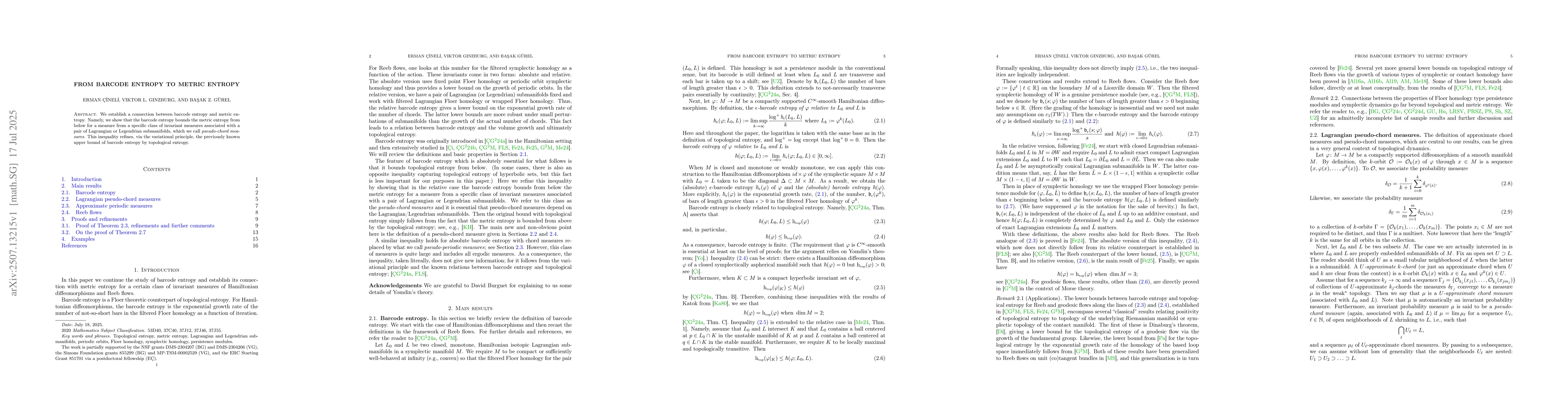 We establish a connection between barcode entropy and metric entropy. Namely, we show that the barcode entropy bounds the metric entropy from below for a measure from a specific class of invariant measures associated with a pair of Lagrangian or Legendrian submanifolds, which we call pseudo-chord measures. This inequality refines, via the variational principle, the previously known upper bound of barcode entropy by topological entropy.