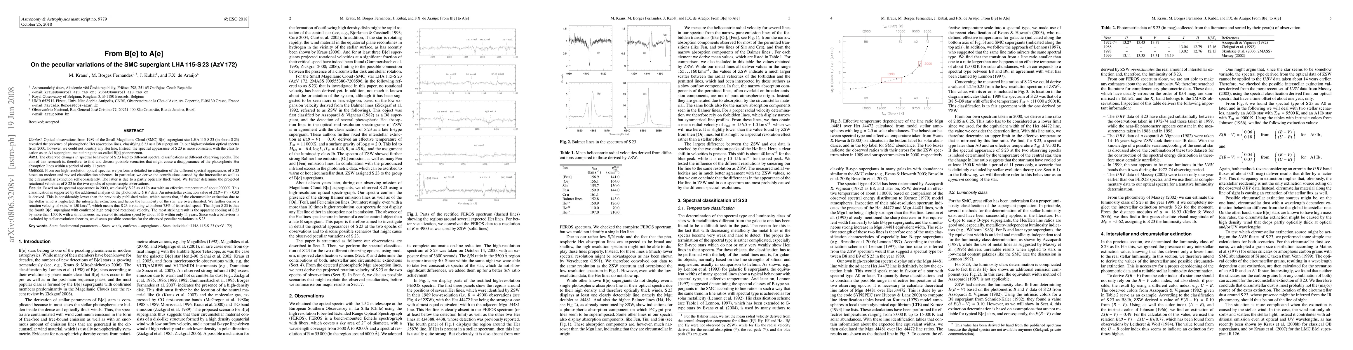 The research examines the unusual spectral changes of the SMC supergiant star S23, initially classified as B[e] then A1Ib in 11 years. Key findings include S23's apparent cooling by over 1500K and increased rotation speed, challenging stellar evolution theories. The study also revises interstellar extinction estimates, lowering E(B-V) from 0.13 to 0.03.
