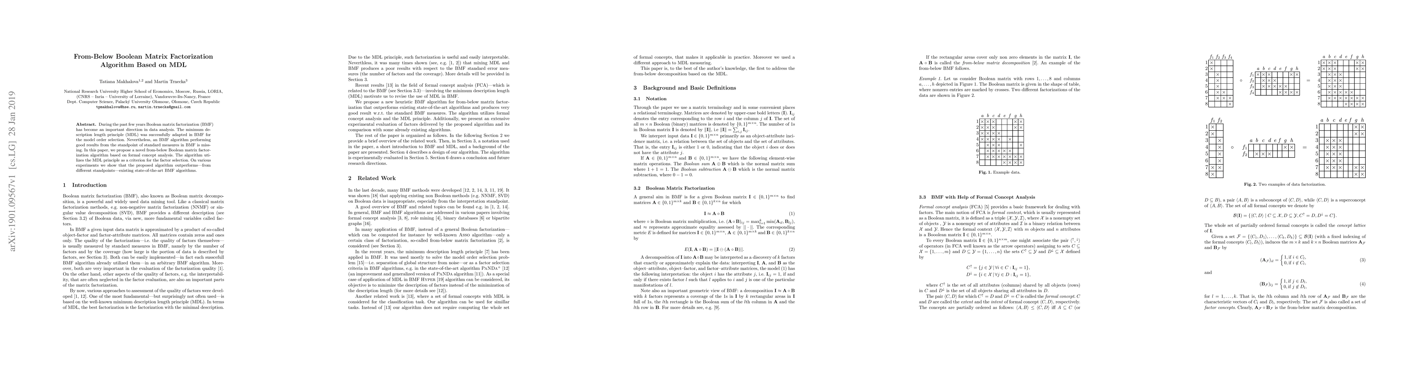 This paper proposes a new from-below Boolean matrix factorization algorithm based on formal concept analysis and the minimum description length principle for model order selection. Experimental results demonstrate that the proposed algorithm outperforms existing state-of-the-art BMF methods on various metrics.