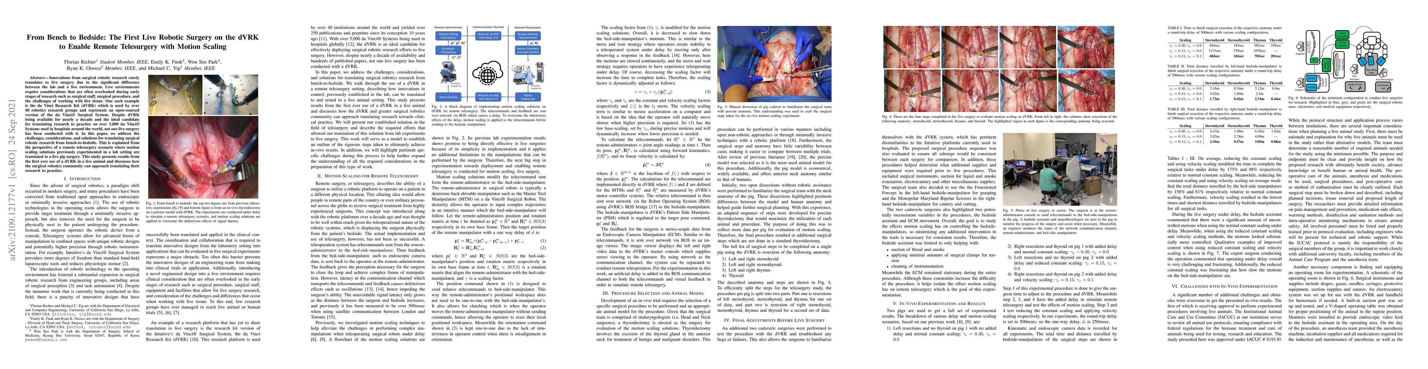 This paper details the first live robotic surgery using the dVRK for remote telesurgery, addressing the challenges of translating surgical robotic research from lab to live environments. The study successfully demonstrates motion scaling solutions in a live pig surgery, providing insights for the surgical robotics community on bridging research and practice.