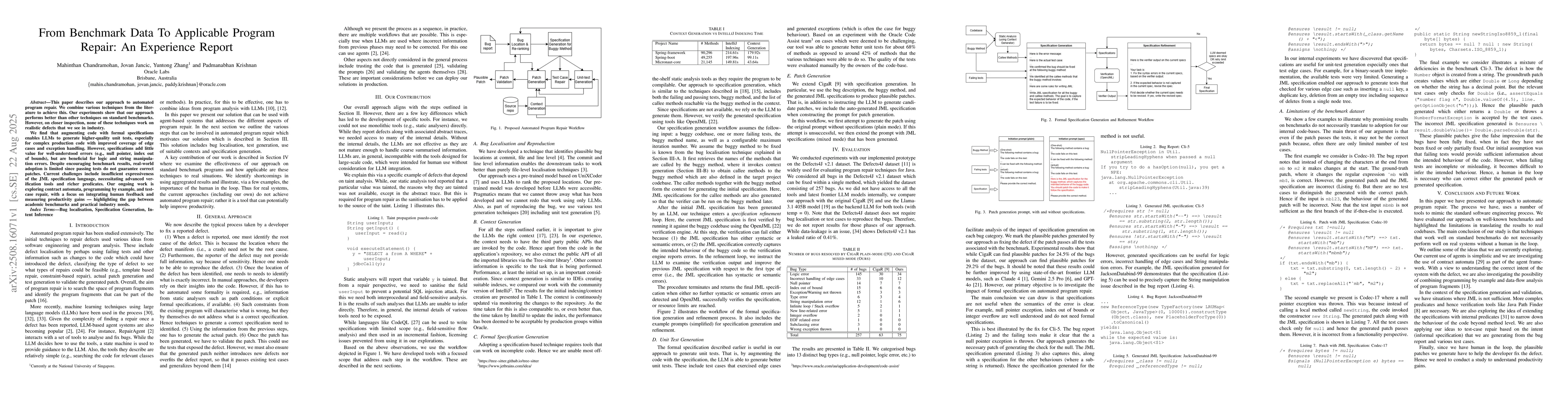 This paper describes our approach to automated program repair. We combine various techniques from the literature to achieve this. Our experiments show that our approach performs better than other techniques on standard benchmarks. However, on closer inspection, none of these techniques work on realistic defects that we see in industry. We find that augmenting code with formal specifications enables LLMs to generate higher-quality unit tests, especially for complex production code with improved coverage of edge cases and exception handling. However, specifications add little value for well-understood errors (e.g., null pointer, index out of bounds), but are beneficial for logic and string manipulation errors. Despite encouraging benchmark results, real-world adoption is limited since passing tests do not guarantee correct patches. Current challenges include insufficient expressiveness of the JML specification language, necessitating advanced verification tools and richer predicates. Our ongoing work is exploring contract automata, programming by example, and testcase repair, with a focus on integrating human feedback and measuring productivity gains - highlighting the gap between academic benchmarks and practical industry needs
