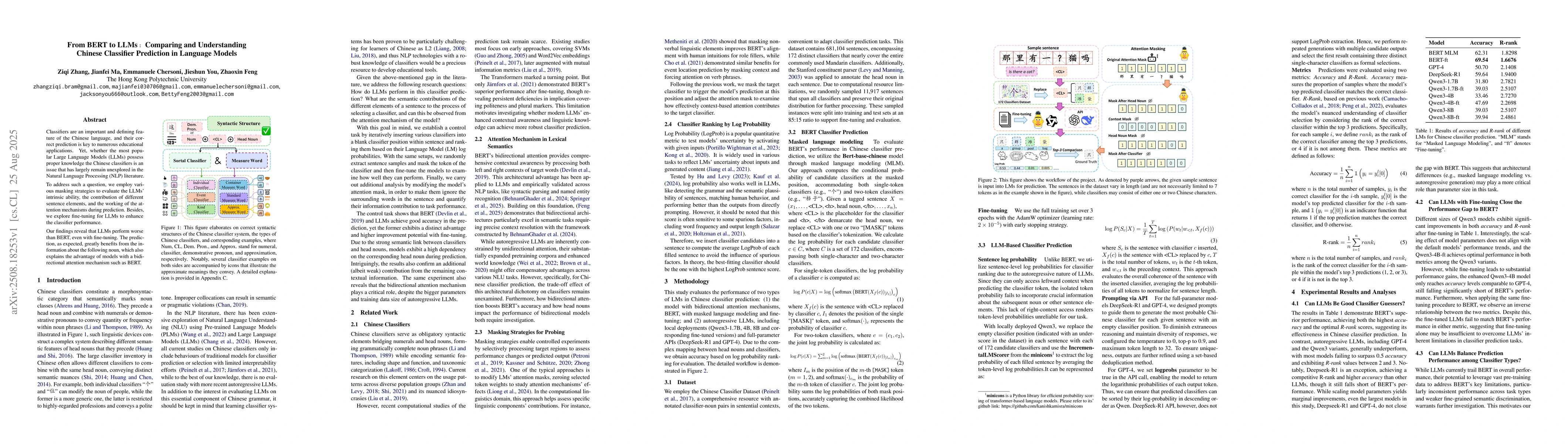 Classifiers are an important and defining feature of the Chinese language, and their correct prediction is key to numerous educational applications. Yet, whether the most popular Large Language Models (LLMs) possess proper knowledge the Chinese classifiers is an issue that has largely remain unexplored in the Natural Language Processing (NLP) literature. To address such a question, we employ various masking strategies to evaluate the LLMs' intrinsic ability, the contribution of different sentence elements, and the working of the attention mechanisms during prediction. Besides, we explore fine-tuning for LLMs to enhance the classifier performance. Our findings reveal that LLMs perform worse than BERT, even with fine-tuning. The prediction, as expected, greatly benefits from the information about the following noun, which also explains the advantage of models with a bidirectional attention mechanism such as BERT.