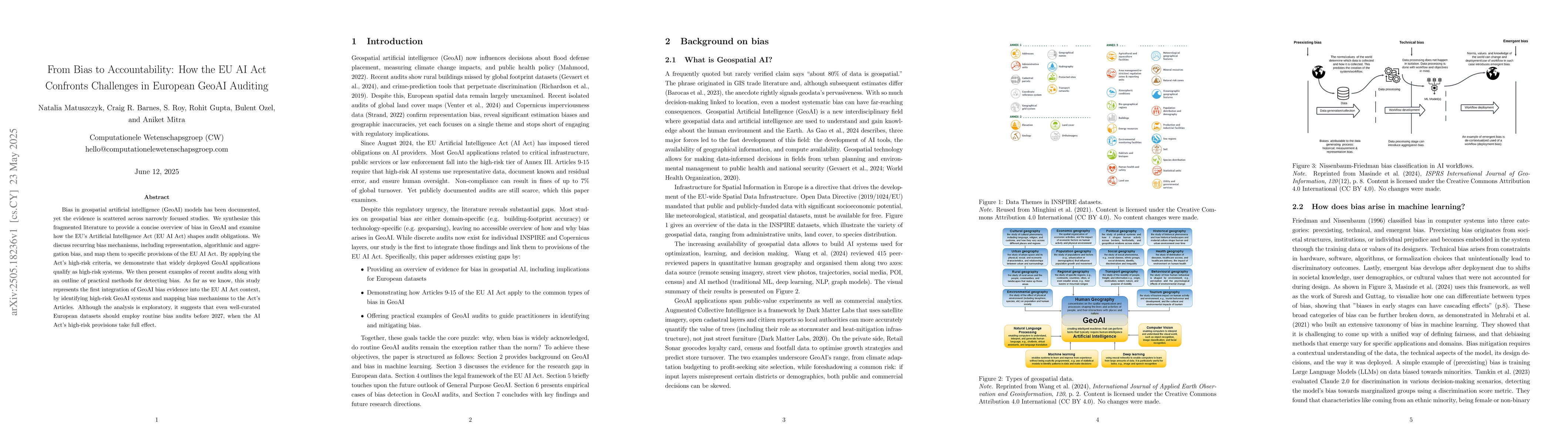 The EU AI Act high-risk provisions apply to widely deployed GeoAI applications, requiring routine bias audits before 2027. The study maps bias mechanisms to the Act's Articles, suggesting that even well-curated datasets should employ bias audits to ensure accountability.
