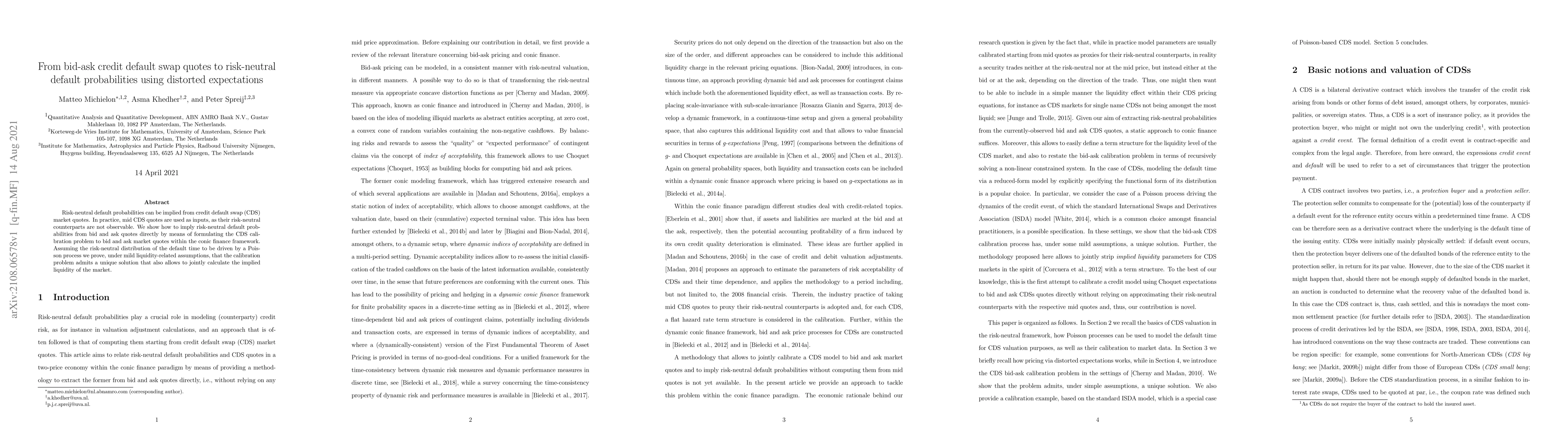 This paper demonstrates a method to derive risk-neutral default probabilities from bid-ask credit default swap quotes using a calibration problem within the conic finance framework. It shows that under mild liquidity assumptions, this approach provides a unique solution and also estimates implied market liquidity.