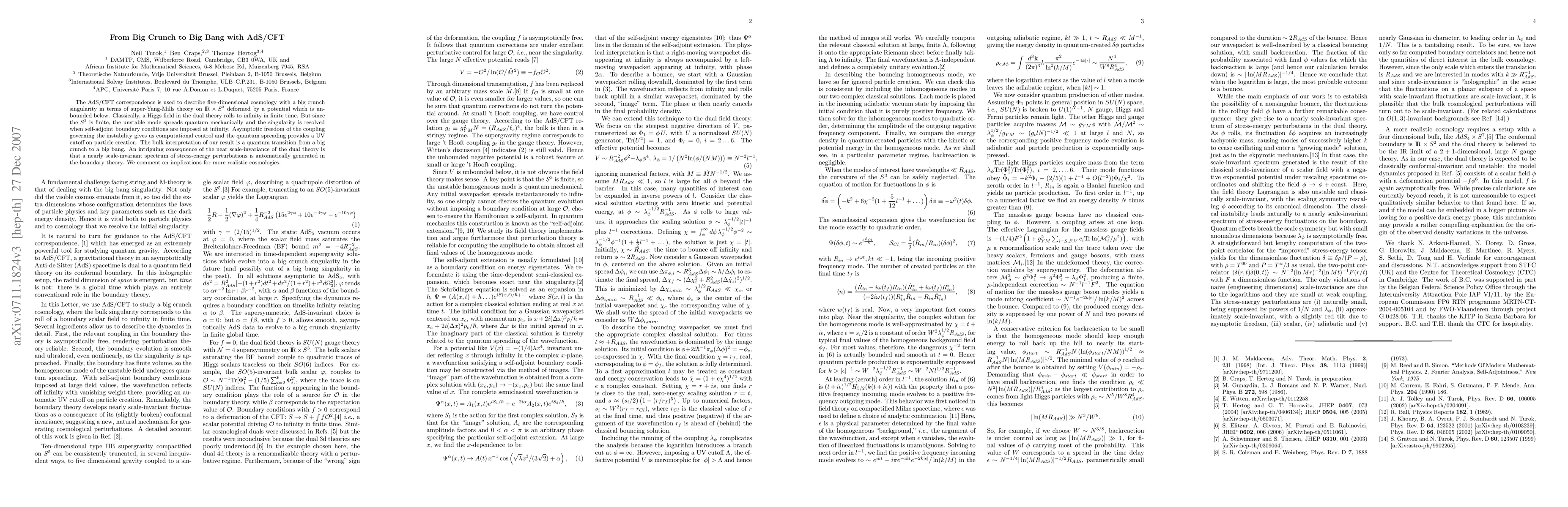 This paper uses the AdS/CFT correspondence to model a five-dimensional cosmology transitioning from a big crunch to a big bang, resolving the singularity through quantum mechanical spreading of an unstable mode. The study highlights the generation of a nearly scale-invariant spectrum of stress-energy perturbations in the boundary theory.