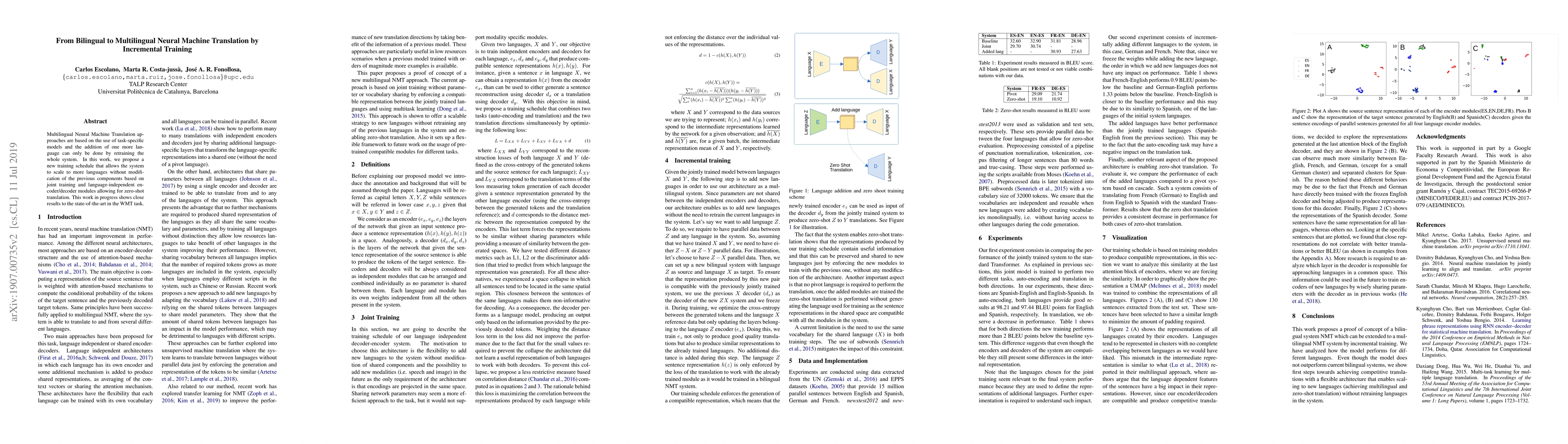 This paper proposes an incremental training schedule for multilingual neural machine translation, enabling the system to scale to more languages without full retraining, using joint training and language-independent encoder/decoder modules. Initial results show competitive performance on the WMT task.
