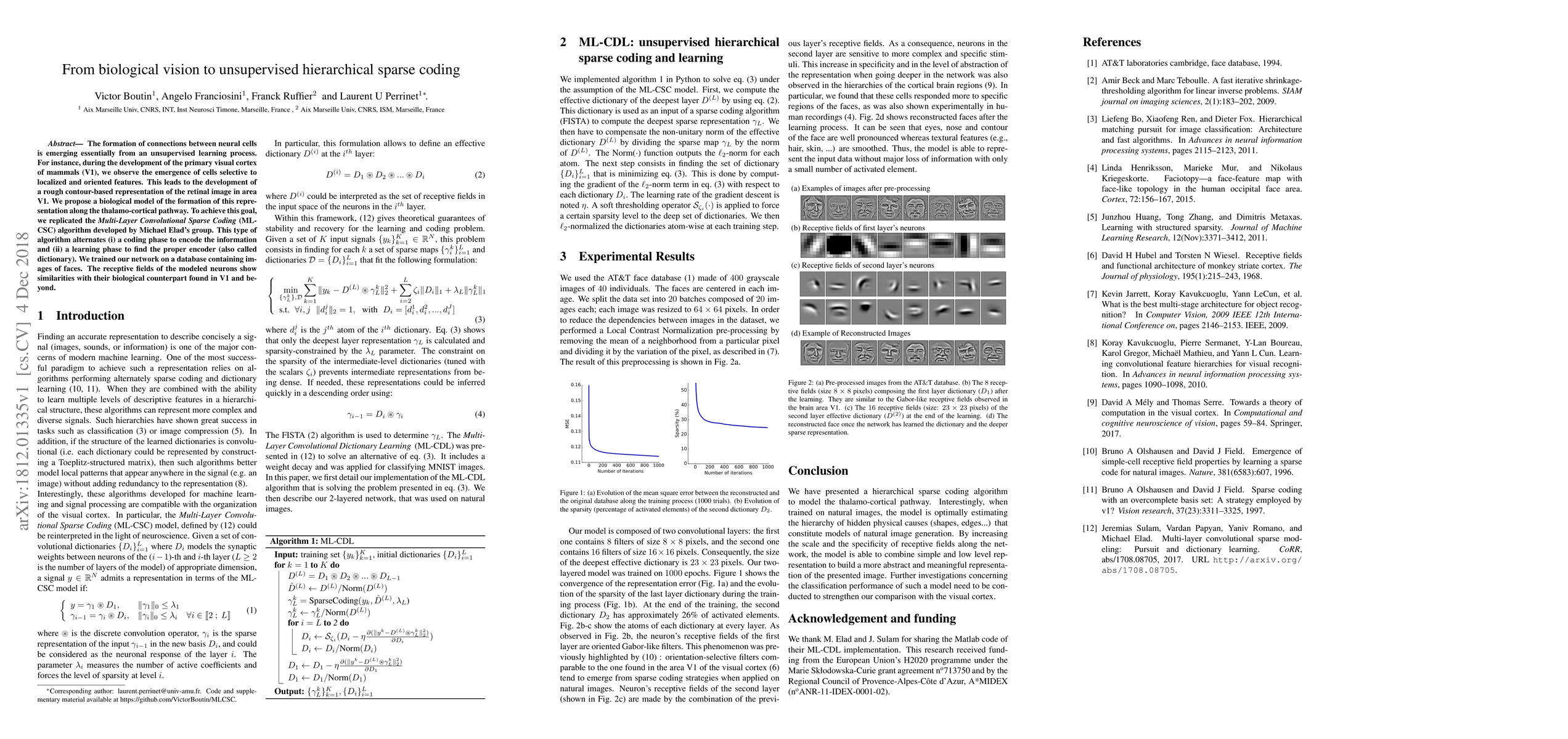 The formation of connections between neural cells is emerging essentially from an unsupervised learning process. For instance, during the development of the primary visual cortex of mammals (V1), we observe the emergence of cells selective to localized and oriented features. This leads to the development of a rough contour-based representation of the retinal image in area V1. We propose a biological model of the formation of this representation along the thalamo-cortical pathway. To achieve this goal, we replicated the Multi-Layer Convolutional Sparse Coding (ML-CSC) algorithm developed by Michael Elad's group.