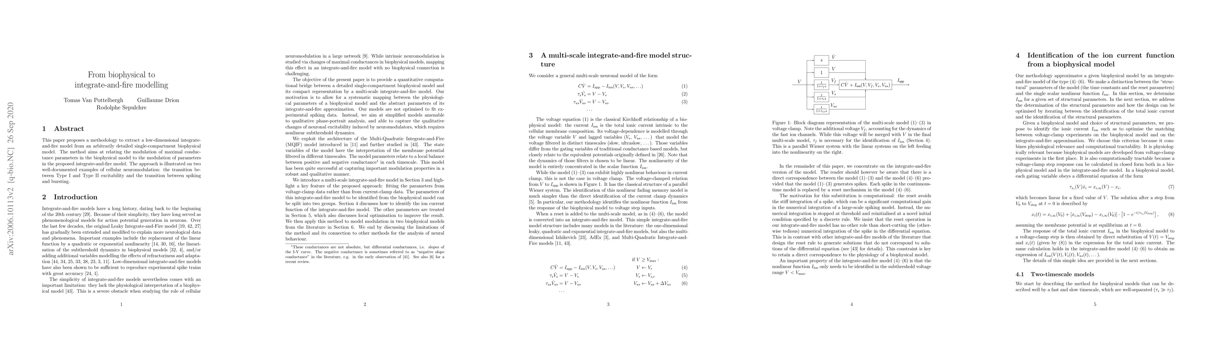 This paper proposes a methodology to extract a low-dimensional integrate-and-fire model from an arbitrarily detailed single-compartment biophysical model. The method aims at relating the modulation of maximal conductance parameters in the biophysical model to the modulation of parameters in the proposed integrate-and-fire model. The approach is illustrated on two well-documented examples of cellular neuromodulation: the transition between Type I and Type II excitability and the transition between spiking and bursting.