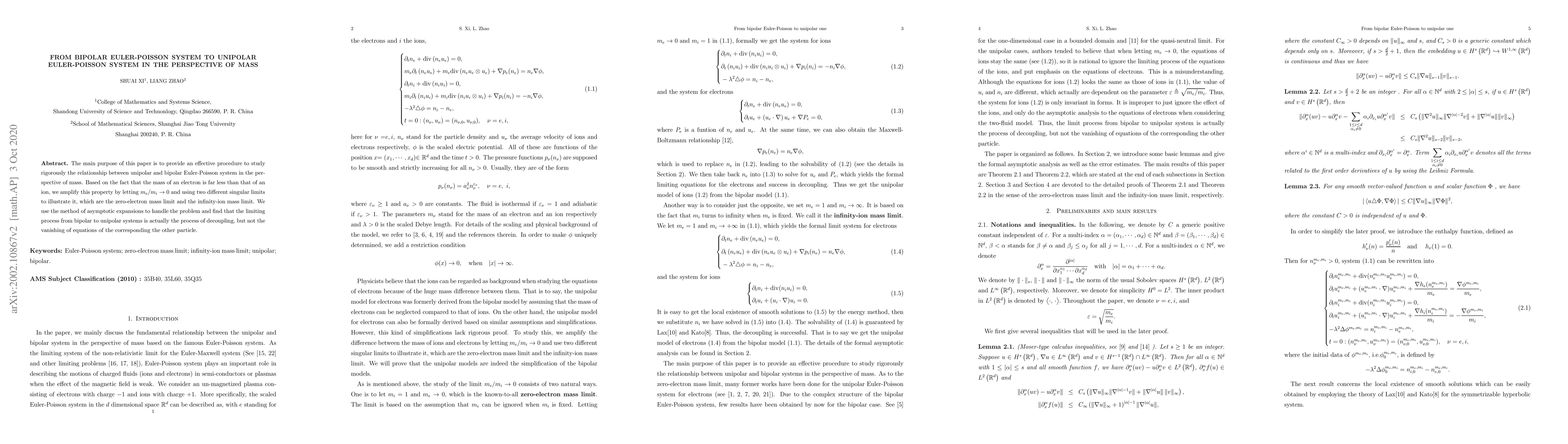 The main purpose of this paper is to provide an effective procedure to study rigorously the relationship between unipolar and bipolar Euler-Poisson system in the perspective of mass. Based on the fact that the mass of an electron is far less than that of an ion, we amplify this property by letting $m_e/m_i\rightarrow 0$ and using two different singular limits to illustrate it, which are zero-electron mass limit and infinity-ion mass limit. We use the method of asymptotic expansion to handle the problem and find that the limiting process from bipolar to unipolar system is actually the process of decoupling, but not the vanishing of equations of the corresponding other particle.