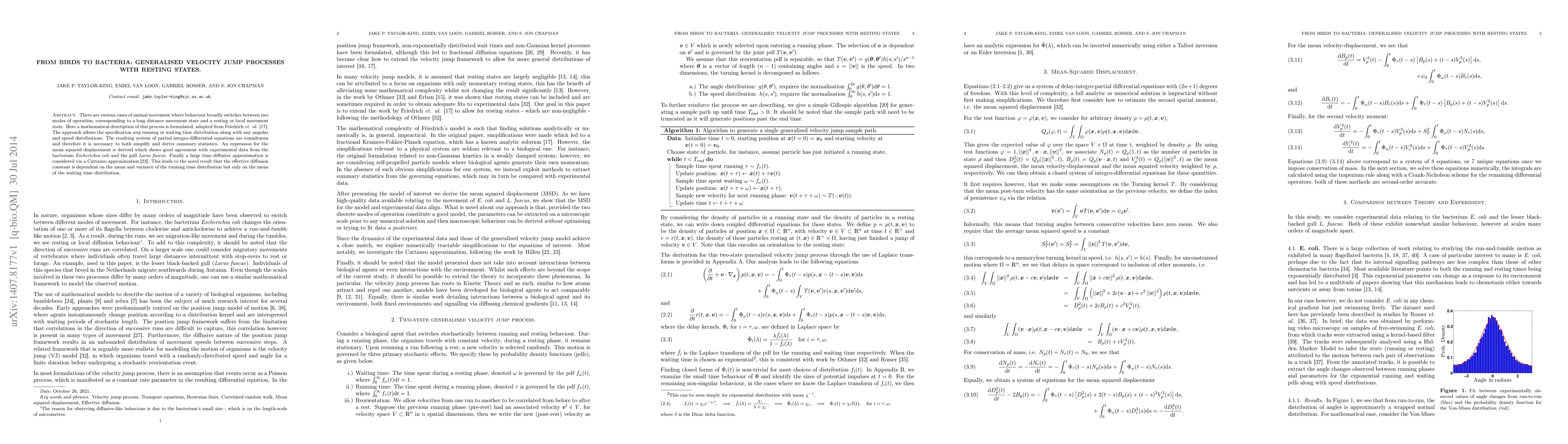 There are various cases of animal movement where behaviour broadly switches between two modes of operation, corresponding to a long distance movement state and a resting or local movement state. Here a mathematical description of this process is formulated, adapted from Friedrich et. al. (2006). The approach allows the specification any running or waiting time distribution along with any angular and speed distributions. The resulting system of partial integro-differential equations are tumultuous and therefore it is necessary to both simplify and derive summary statistics. An expression for the mean squared displacement is derived which shows good agreement with experimental data from the bacterium Escherichia coli and the gull Larus fuscus. Finally a large time diffusive approximation is considered via a Cattaneo approximation (Hillen, 2004). This leads to the novel result that the effective diffusion constant is dependent on the mean and variance of the running time distribution but only on the mean of the waiting time distribution.