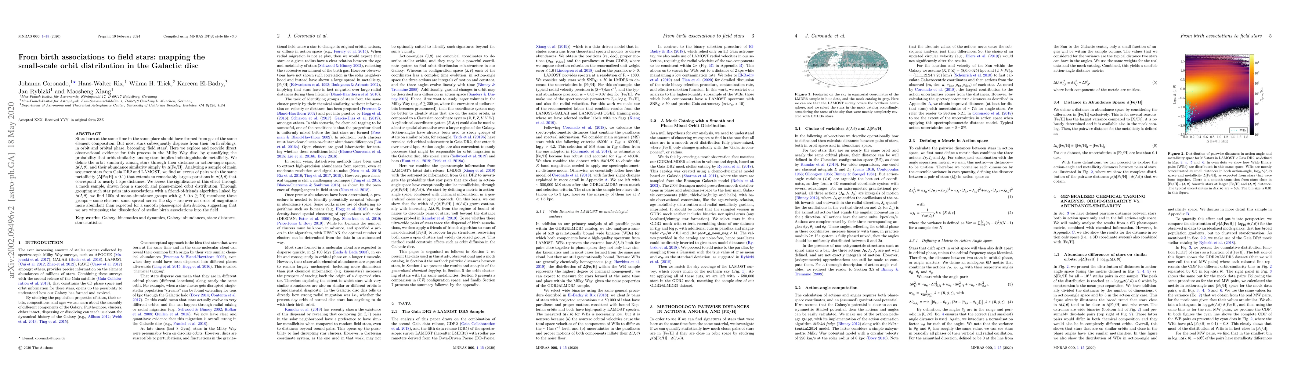 Stars born at the same time in the same place should have formed from gas of the same element composition. But most stars subsequently disperse from their birth siblings, in orbit and orbital phase, becoming 'field stars'. Here we explore and provide direct observational evidence for this process in the Milky Way disc, by quantifying the probability that orbit-similarity among stars implies indistinguishable metallicity. We define the orbit similarity among stars through their distance in action-angle space, $\Delta (J,\theta)$, and their abundance similarity simply by $\Delta$[Fe/H]. Analyzing a sample of main sequence stars from Gaia DR2 and LAMOST, we find an excess of pairs with the same metallicity ($\Delta\mathrm{[Fe/H]}<0.1$) that extends to remarkably large separations in $\Delta (J,\theta)$ that correspond to nearly 1 kpc distances. We assess the significance of this effect through a mock sample, drawn from a smooth and phase-mixed orbit distribution. Through grouping such star pairs into associations with a friend-of-friends algorithm linked by $\Delta (J,\theta)$, we find 100s of mono-abundance groups with $\ge 3$ (to $\gtrsim 20$) members; these groups -- some clusters, some spread across the sky -- are over an order-of-magnitude more abundant than expected for a smooth phase-space distribution, suggesting that we are witnessing the 'dissolution' of stellar birth associations into the field.