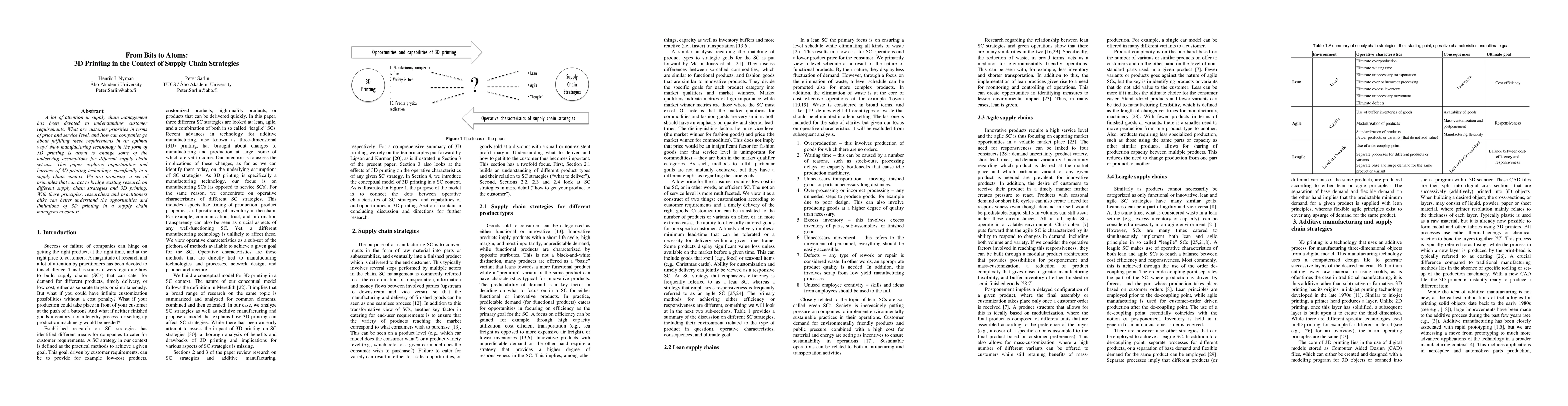 A lot of attention in supply chain management has been devoted to understanding customer requirements. What are customer priorities in terms of price and service level, and how can companies go about fulfilling these requirements in an optimal way? New manufacturing technology in the form of 3D printing is about to change some of the underlying assumptions for different supply chain set-ups. This paper explores opportunities and barriers of 3D printing technology, specifically in a supply chain context. We are proposing a set of principles that can act to bridge existing research on different supply chain strategies and 3D printing. With these principles, researchers and practitioners alike can better understand the opportunities and limitations of 3D printing in a supply chain management context.