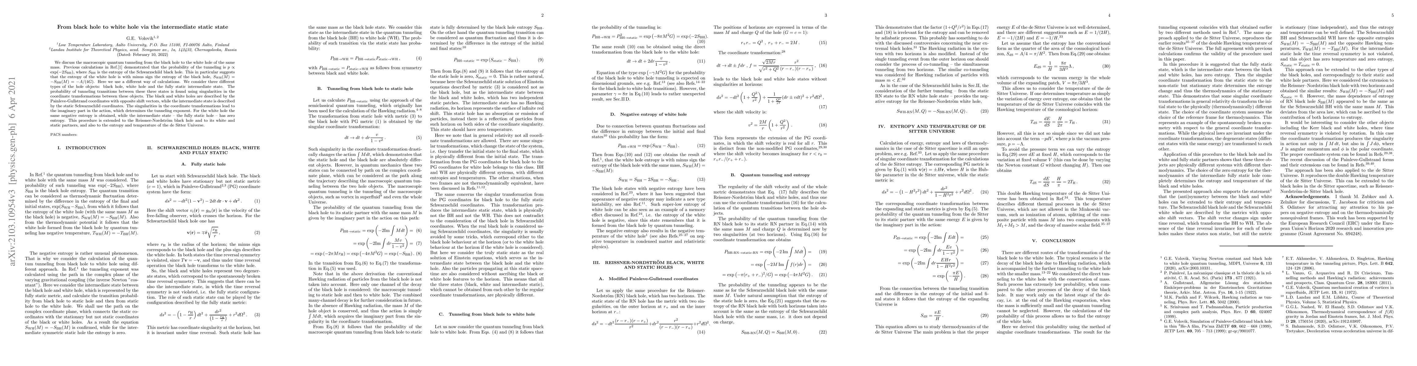 We discuss the macroscopic quantum tunneling from the black hole to the white hole of the same mass. Previous calculations in Ref.[1] demonstrated that the probability of the tunneling is $p \propto \exp(-2S_\text{BH})$, where $S_\text{BH}$ is the entropy of the Schwarzschild black hole. This in particular suggests that the entropy of the white hole is with minus sign the entropy of the black hole, $S_\text{WH}(M)=- S_\text{BH}(M)= - A/(4G)$. Here we use a different way of calculations. We consider three different types of the hole objects: black hole, white hole and the fully static intermediate state. The probability of tunneling transitions between these three states is found using singularities in the coordinate transformations between these objects. The black and white holes are described by the Painleve-Gullstrand coordinates with opposite shift vectors, while the intermediate state is described by the static Schwarzschild coordinates. The singularities in the coordinate transformations lead to the imaginary part in the action, which determines the tunneling exponent. For the white hole the negative entropy is obtained, while the intermediate state -- the fully static hole -- has zero entropy. This procedure is extended to the Reissner-Nordstr\"om black hole and to its white and static partners, and also to the entropy and temperature of the de Sitter Universe.