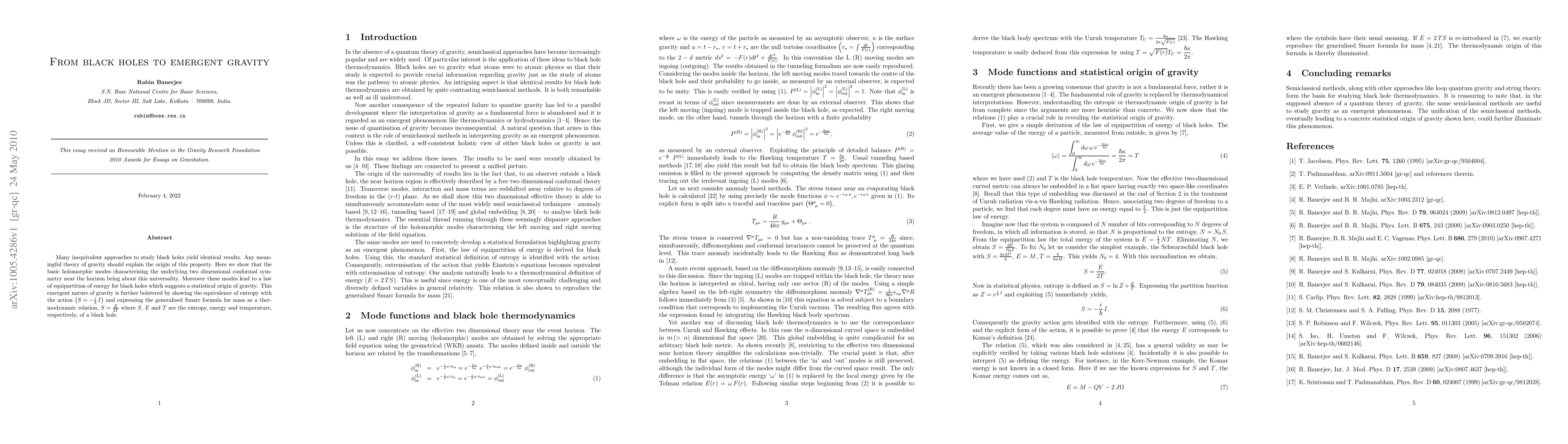 Many inequivalent approaches to study black holes yield identical results. Any meaningful theory of gravity should explain the origin of this property. Here we show that the basic holomorphic modes characterising the underlying two dimensional conformal symmetry near the horizon bring about this universality. Moreover these modes lead to a law of equipartition of energy for black holes which suggests a statistical origin of gravity. This emergent nature of gravity is further bolstered by showing the equivalence of entropy with the action $\left(S=-\frac{i}{\hbar}\,I\right)$ and expressing the generalised Smarr formula for mass as a thermodynamic relation, $S=\frac{E}{2T}$ where $S$, $E$ and $T$ are the entropy, energy and temperature, respectively, of a black hole.