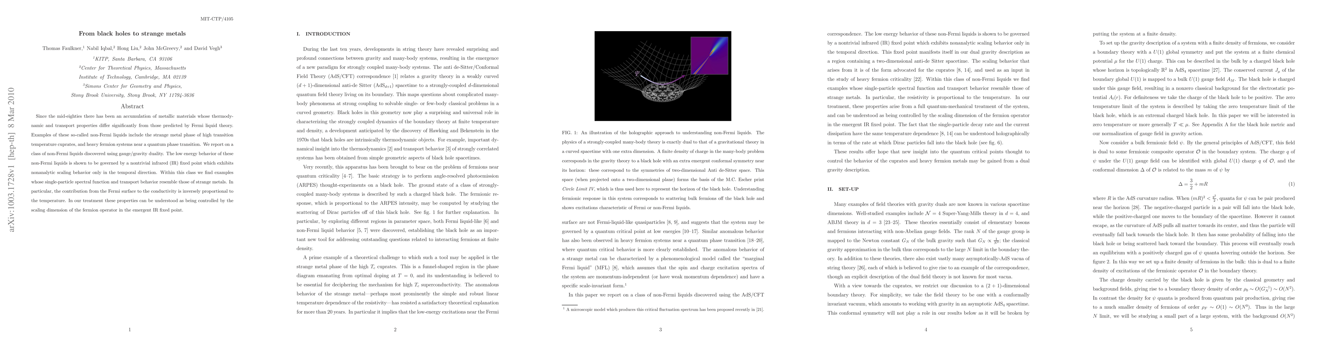 Since the mid-eighties there has been an accumulation of metallic materials whose thermodynamic and transport properties differ significantly from those predicted by Fermi liquid theory. Examples of these so-called non-Fermi liquids include the strange metal phase of high transition temperature cuprates, and heavy fermion systems near a quantum phase transition. We report on a class of non-Fermi liquids discovered using gauge/gravity duality. The low energy behavior of these non-Fermi liquids is shown to be governed by a nontrivial infrared (IR) fixed point which exhibits nonanalytic scaling behavior only in the temporal direction. Within this class we find examples whose single-particle spectral function and transport behavior resemble those of strange metals. In particular, the contribution from the Fermi surface to the conductivity is inversely proportional to the temperature. In our treatment these properties can be understood as being controlled by the scaling dimension of the fermion operator in the emergent IR fixed point.