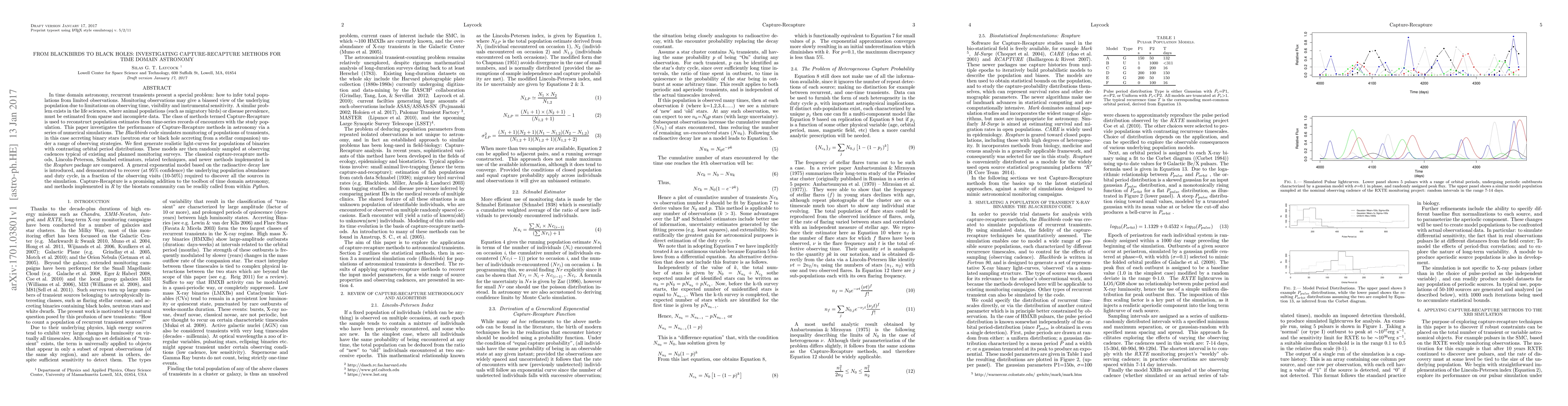 In time domain astronomy, recurrent transients present a special problem: how to infer total populations from limited observations. Monitoring observations may give a biassed view of the underlying population due to limitations on observing time, visibility and instrumental sensitivity. A similar problem exists in the life sciences, where animal populations (such as migratory birds) or disease prevalence, must be estimated from sparse and incomplete data. The class of methods termed Capture-Recapture is used to reconstruct population estimates from time-series records of encounters with the study population. This paper investigates the performance of Capture-Recapture methods in astronomy via a series of numerical simulations. The Blackbirds code simulates monitoring of populations of transients, in this case accreting binary stars (neutron star or black hole accreting from a stellar companion) under a range of observing strategies. We first generate realistic light-curves for populations of binaries with contrasting orbital period distributions. These models are then randomly sampled at observing cadences typical of existing and planned monitoring surveys. The classical capture-recapture methods, Lincoln-Peterson, Schnabel estimators, related techniques, and newer methods implemented in the Rcapture package are compared. A general exponential model based on the radioactive decay law is introduced, and demonstrated to recover (at 95% confidence) the underlying population abundance and duty cycle, in a fraction of the observing visits (10-50%) required to discover all the sources in the simulation. Capture-Recapture is a promising addition to the toolbox of time domain astronomy, and methods implemented in R by the biostats community can be readily called from within Python.