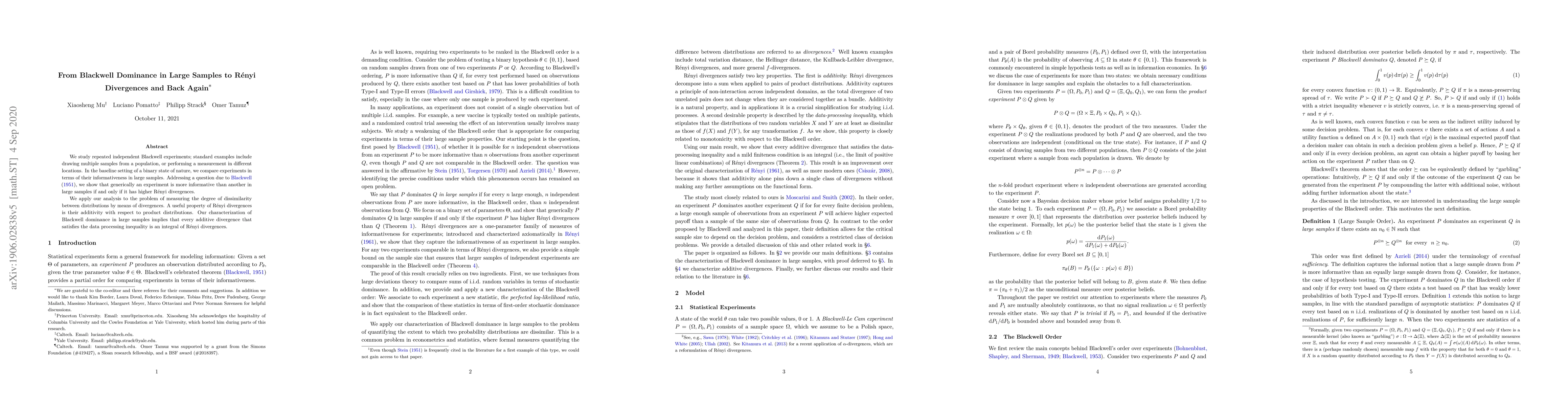 This paper explores the relationship between Blackwell dominance and Renyi divergences in large sample experiments, showing that an experiment is more informative if it has higher Renyi divergences. It also demonstrates that any additive divergence satisfying the data processing inequality can be expressed as an integral of Renyi divergences.