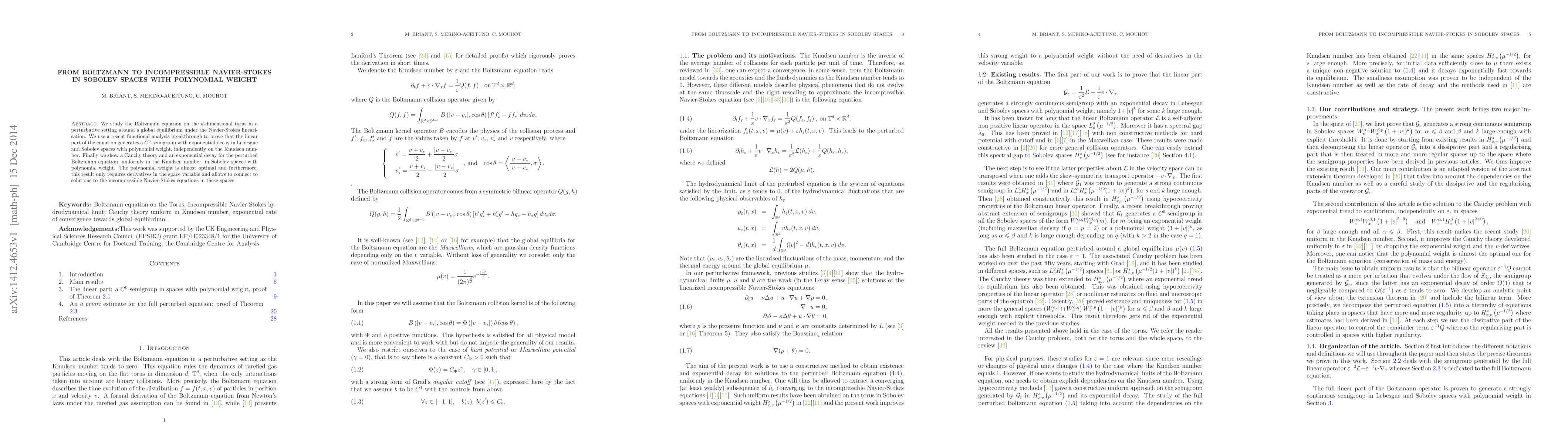 We study the Boltzmann equation on the $d$-dimensional torus in a perturbative setting around a global equilibrium under the Navier-Stokes linearisation. We use a recent functional analysis breakthrough to prove that the linear part of the equation generates a $C^0$-semigroup with exponential decay in Lebesgue and Sobolev spaces with polynomial weight, independently on the Knudsen number. Finally we show a Cauchy theory and an exponential decay for the perturbed Boltzmann equation, uniformly in the Knudsen number, in Sobolev spaces with polynomial weight. The polynomial weight is almost optimal and furthermore, this result only requires derivatives in the space variable and allows to connect to solutions to the incompressible Navier-Stokes equations in these spaces.